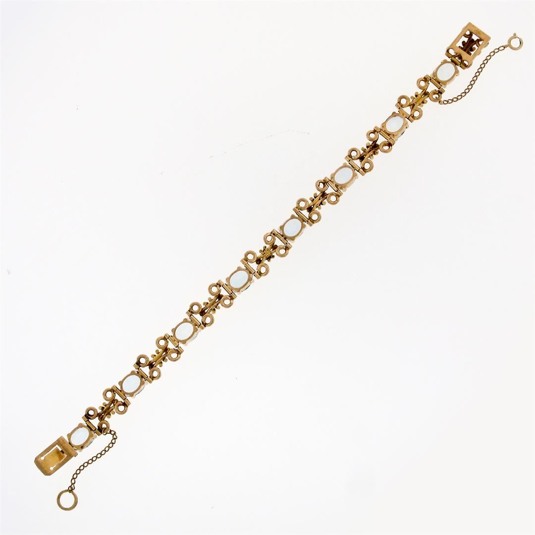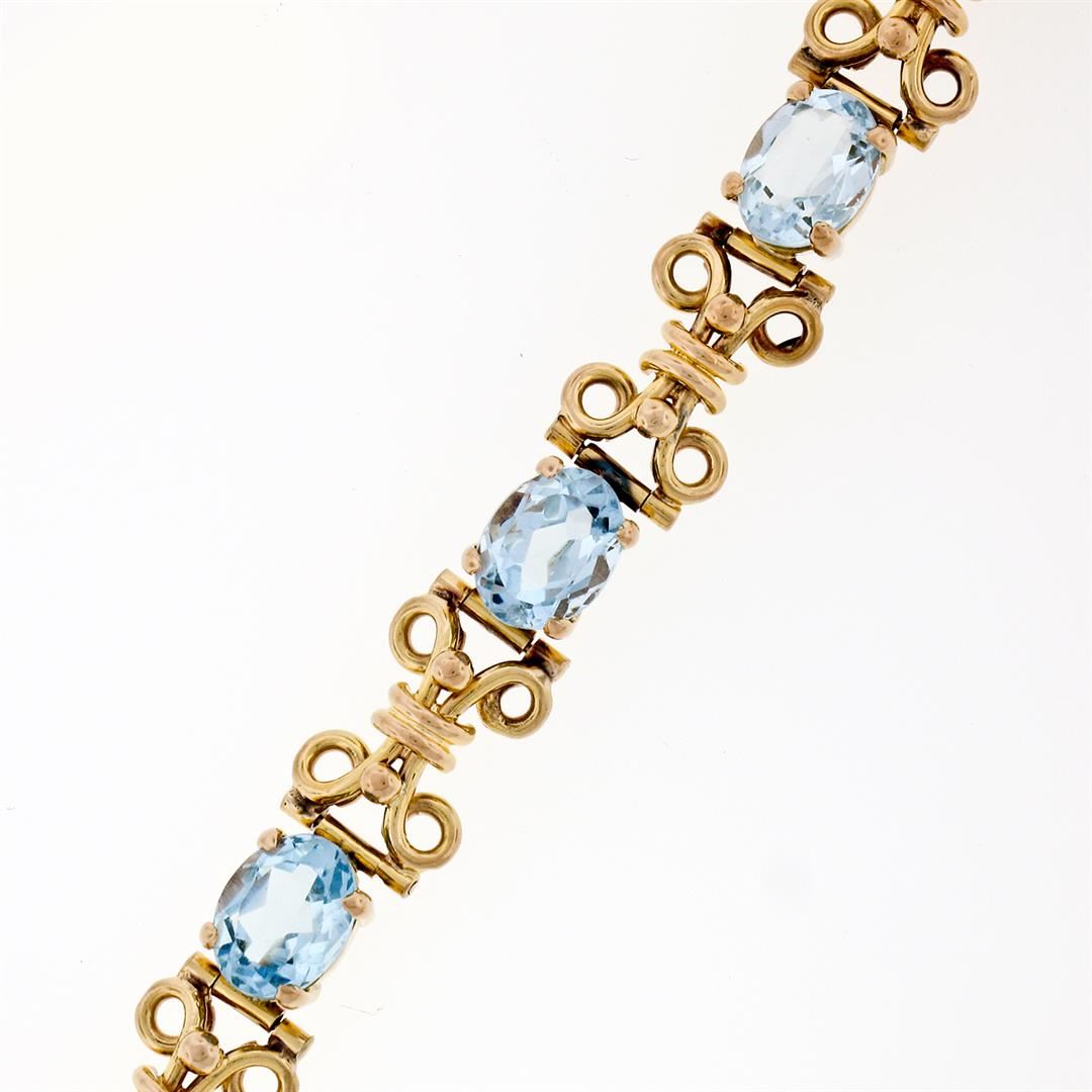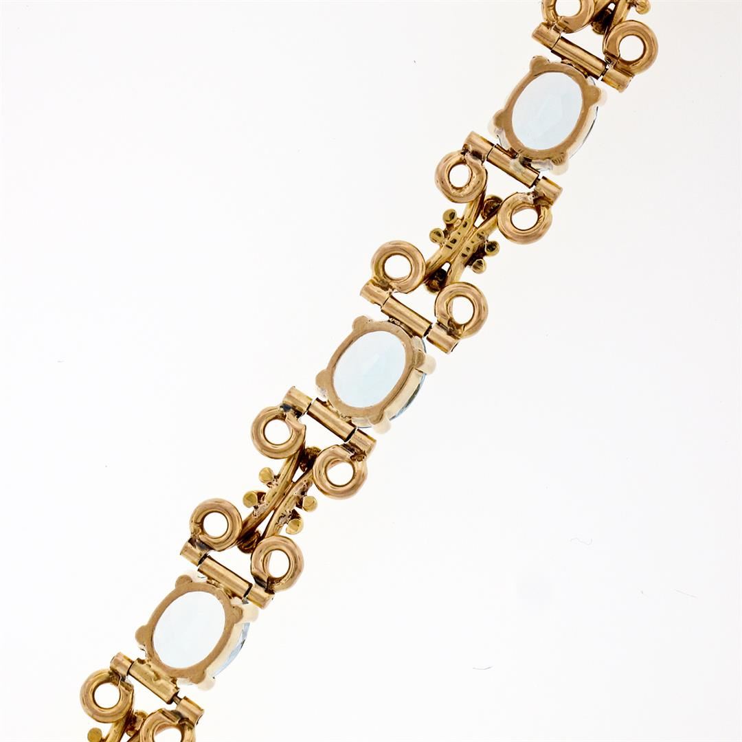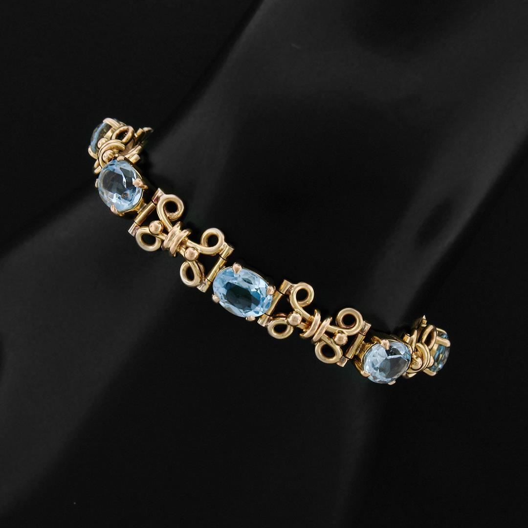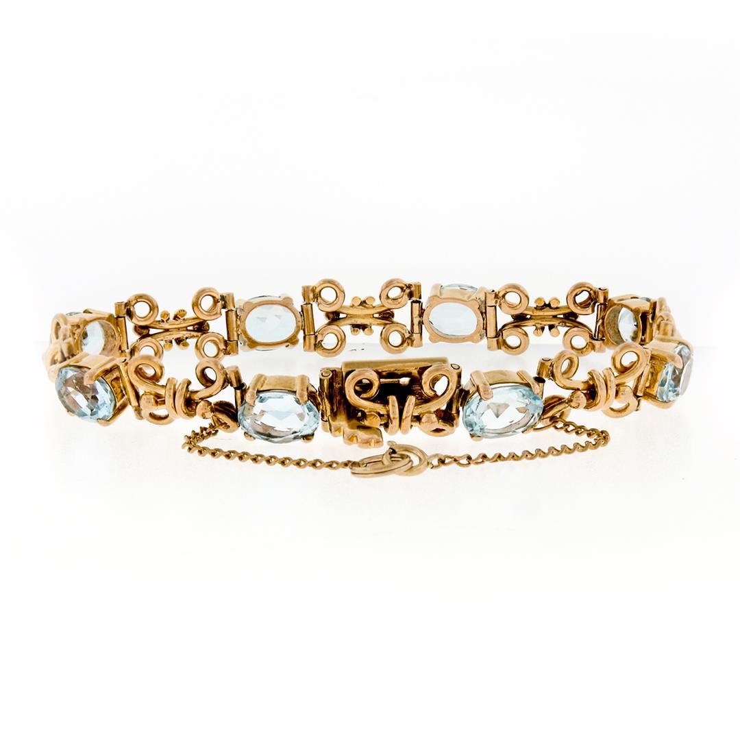 A vintage solid 18k yellow gold open link bracelet, with 8 oval cut natural aquamarine (8.0x6.0mm- 9.00ctw). It weighs a total of 17.88 grams, measures 8.70mm wide, and measures 6.5 inches in length.