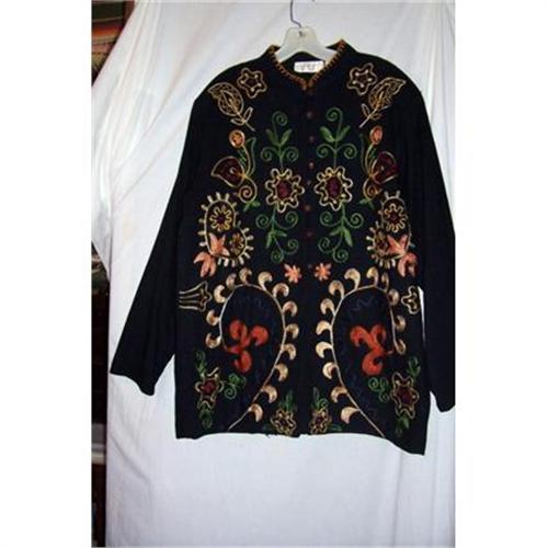 Very striking black India shirt/jacket. Beautifull woven cotton, hand embroidered, bright colors on black. I can see this with slacks, jeans, skirts, a very versatile piece. Distributed by Pier One. Measures 30 inches from neck to hem, 46 inches in the chest, armpit to armpit, and the sleeve inseam is 20 inches. A really good size, to wear as a jacket, or a tunic. In near mint condition, no damage I can see. Thanks for shopping in the Land of Enchantment!