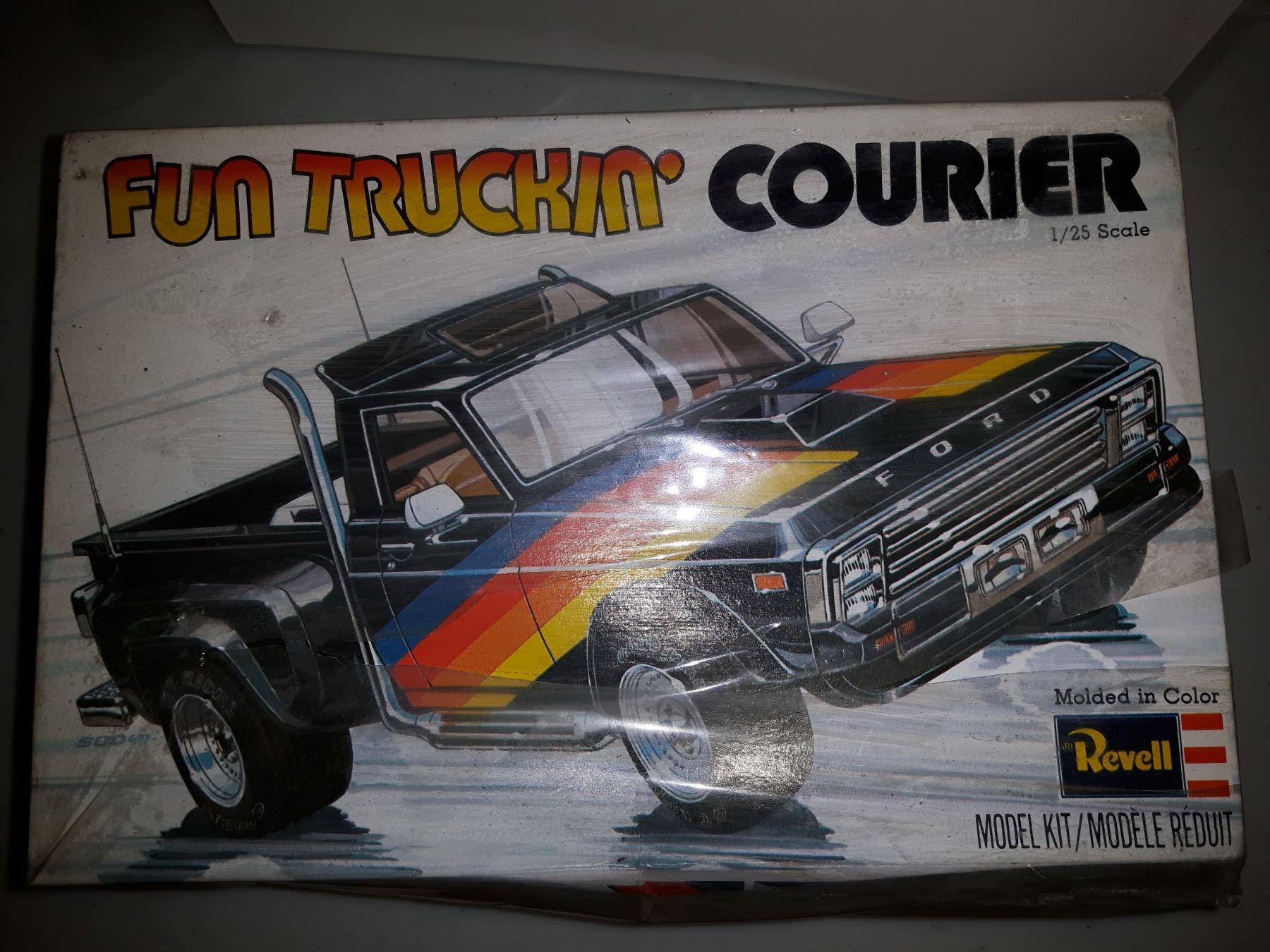 Vintage Revell Fun Truckin Courier Ford Pick up 1/25th scale model. Still "sealed" - the wrapping is there but it is coming apart.