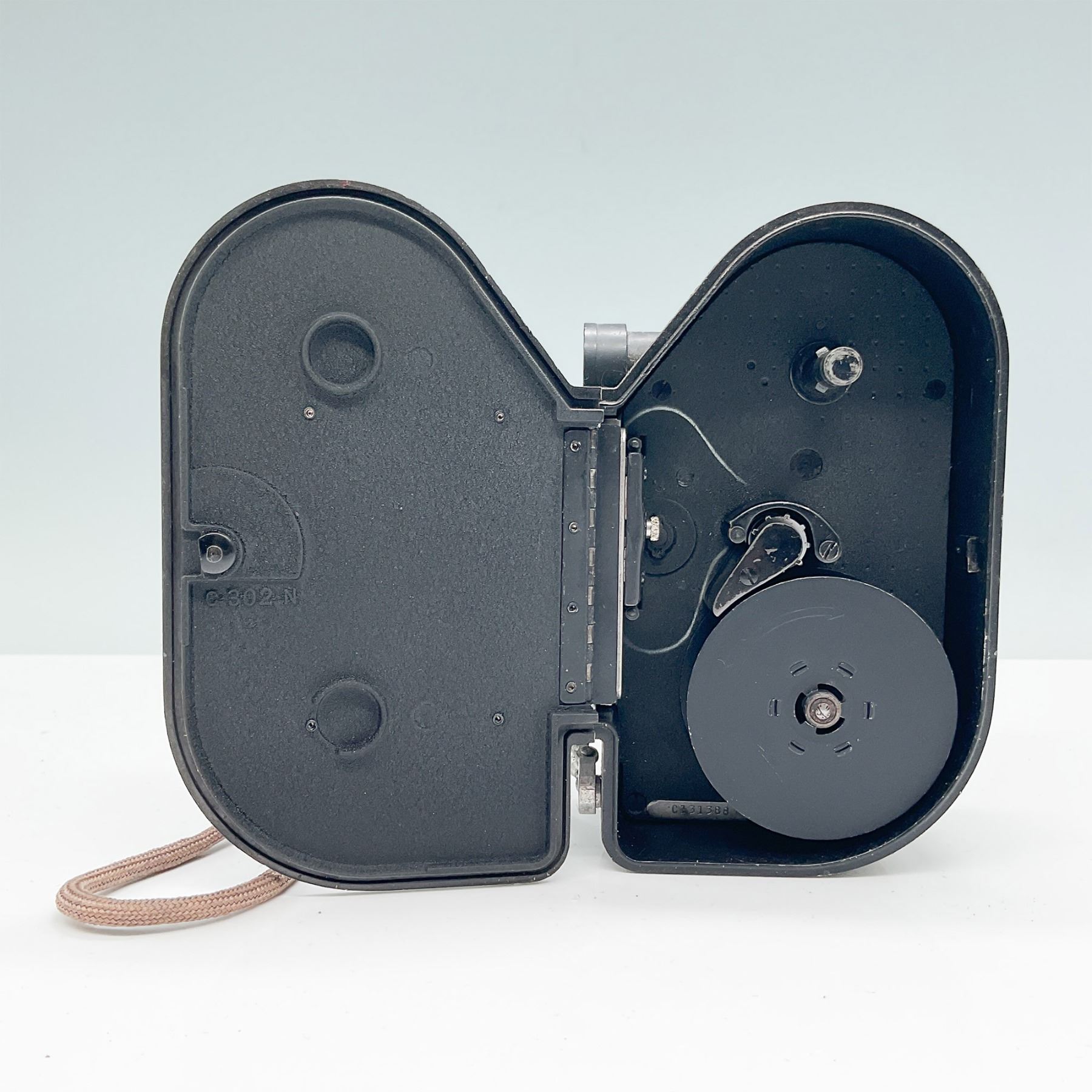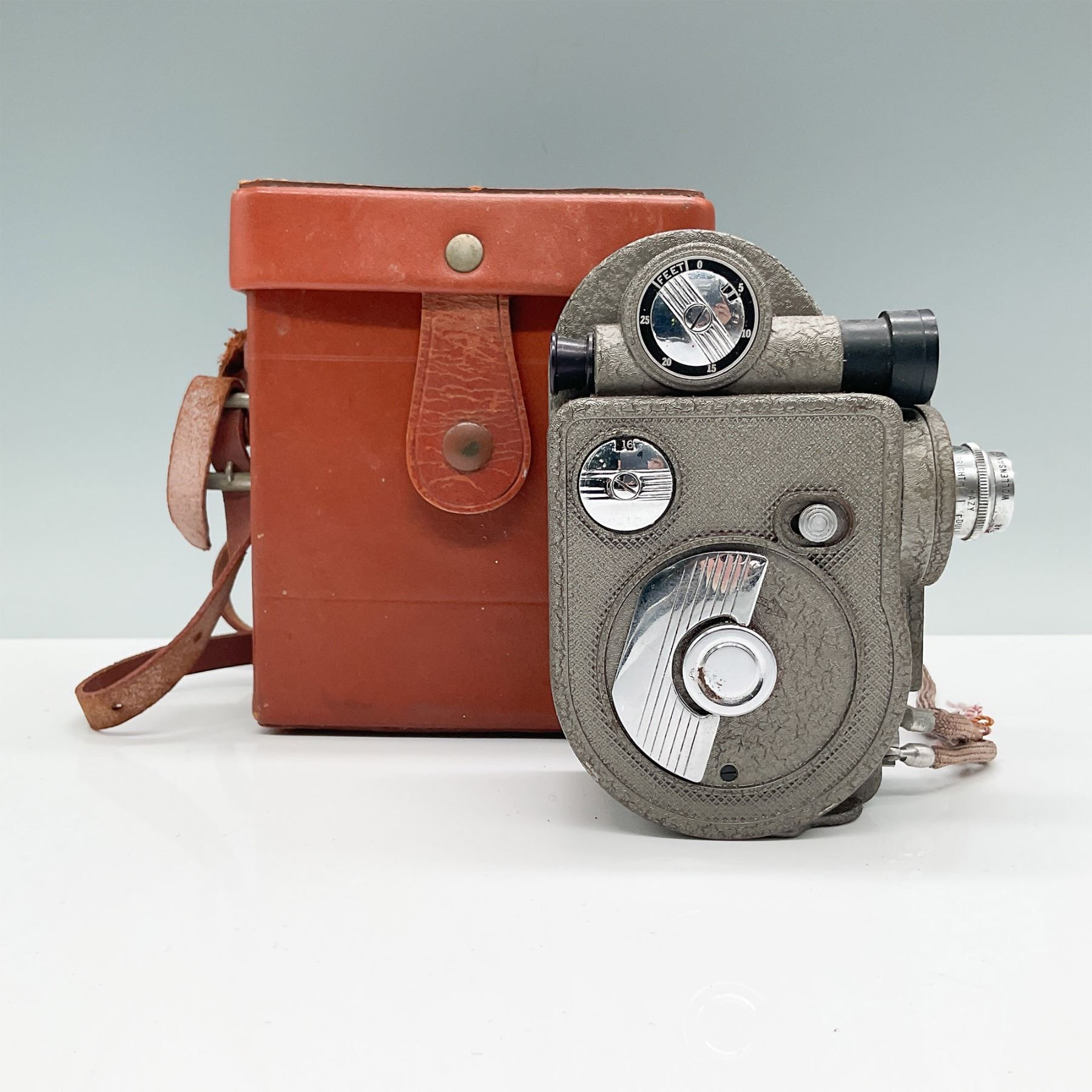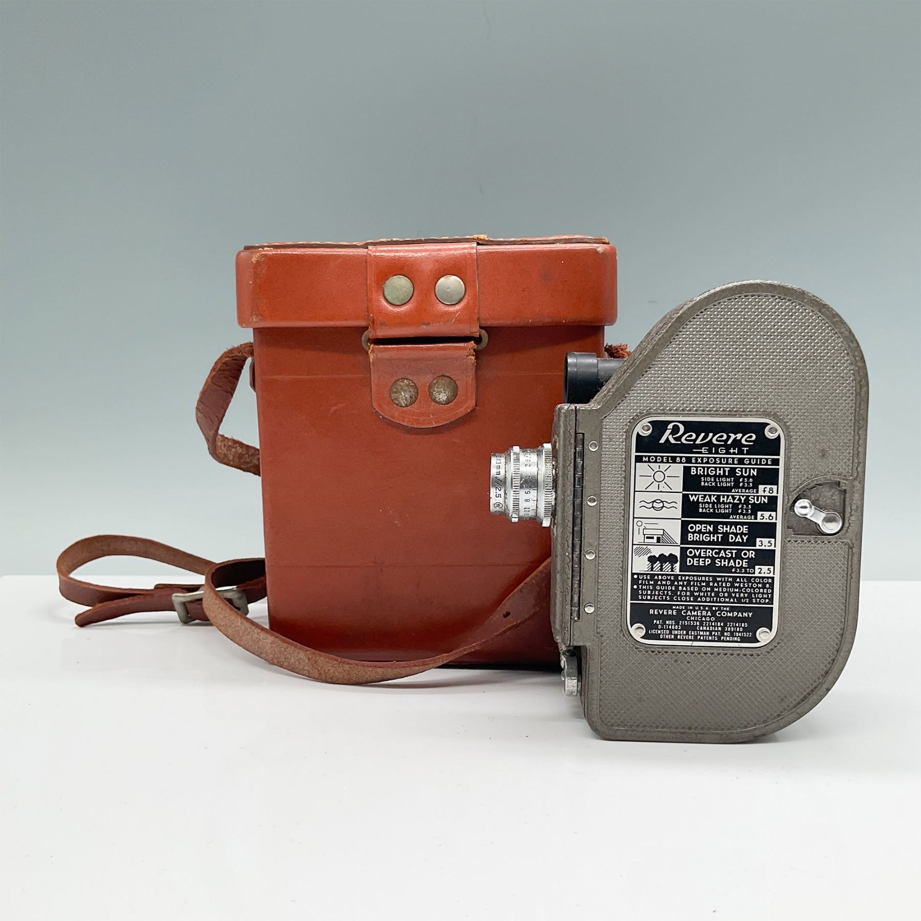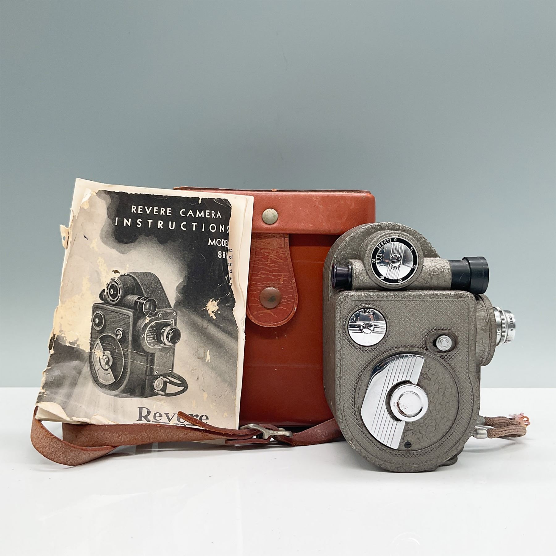 The Revere Model 88 8mm film camera, produced between 1940 and 1946 by the Revere Camera Company, was an innovative and affordable option for amateur filmmakers of its time. Designed for ease of use, it features a 12.5mm f/2.5 Cine Velostigmat lens, multiple filming speeds (8, 12, 16, 24, and 32 fps), and manual exposure settings. This compact and durable camera utilizes double 8mm film, providing flexibility for home movie-making enthusiasts. With its hand-cranked motor and textured metal body for secure handling, the Model 88 became a popular choice for capturing family moments and creative projects during the mid-20th century. A true piece of filmmaking history, this camera comes with its original leather case and instruction manual, which shows signs of use.