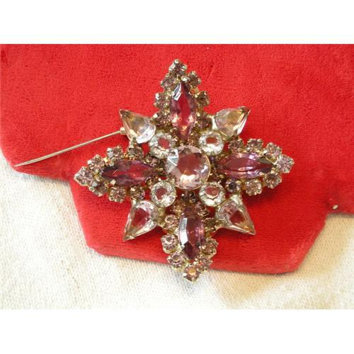 A beautiful vintage rhinestone pin in excellent condition. This butterfly shaped pin has many different shaped and heights of purple and lavender stones, including marquise, rounds and teardrop.