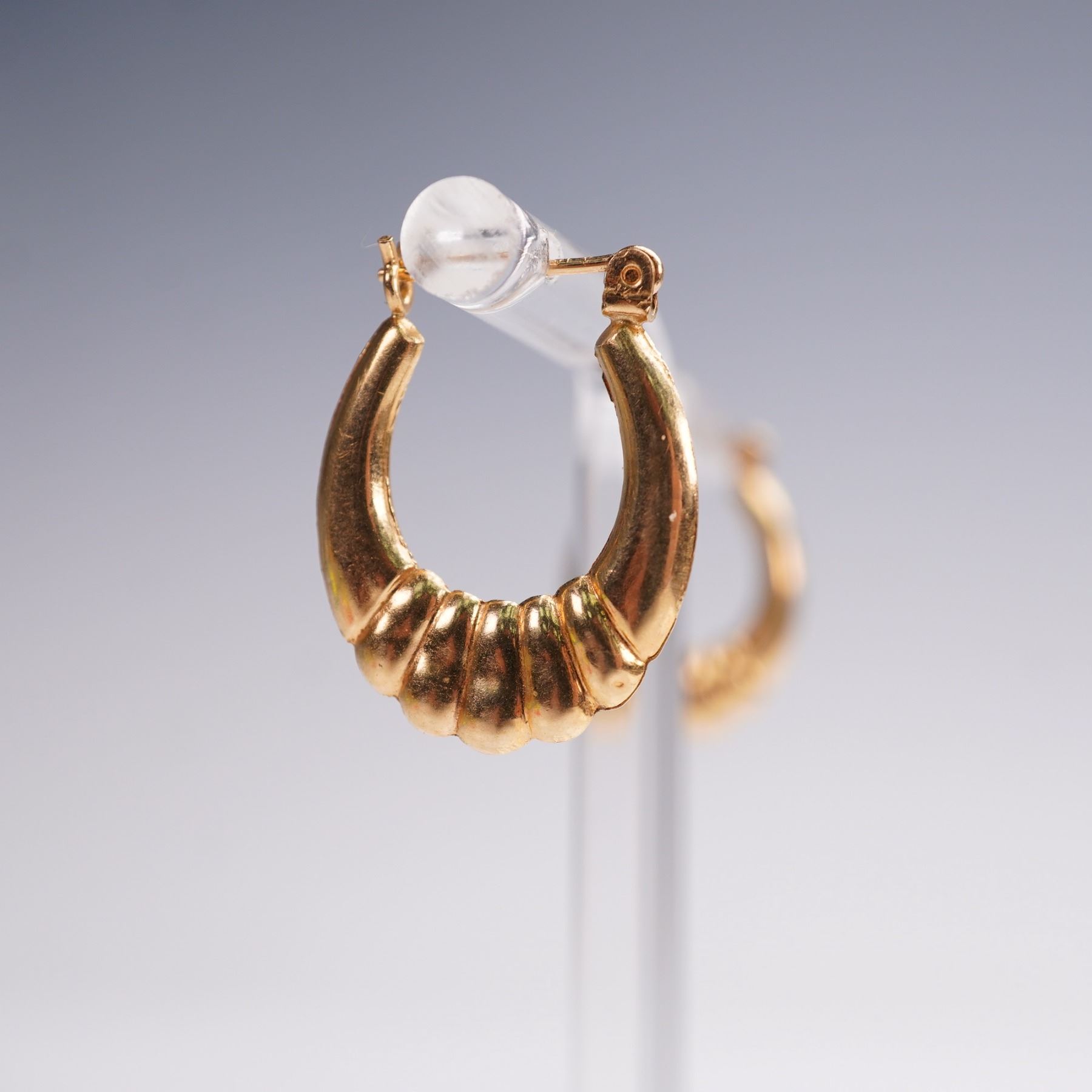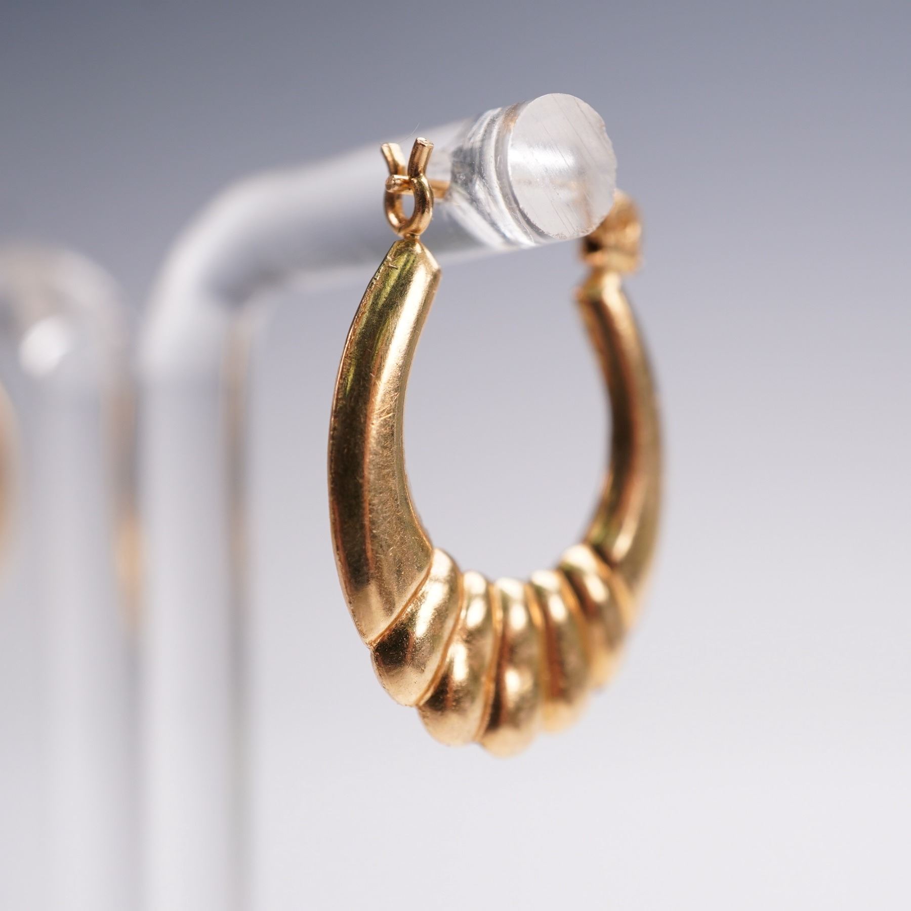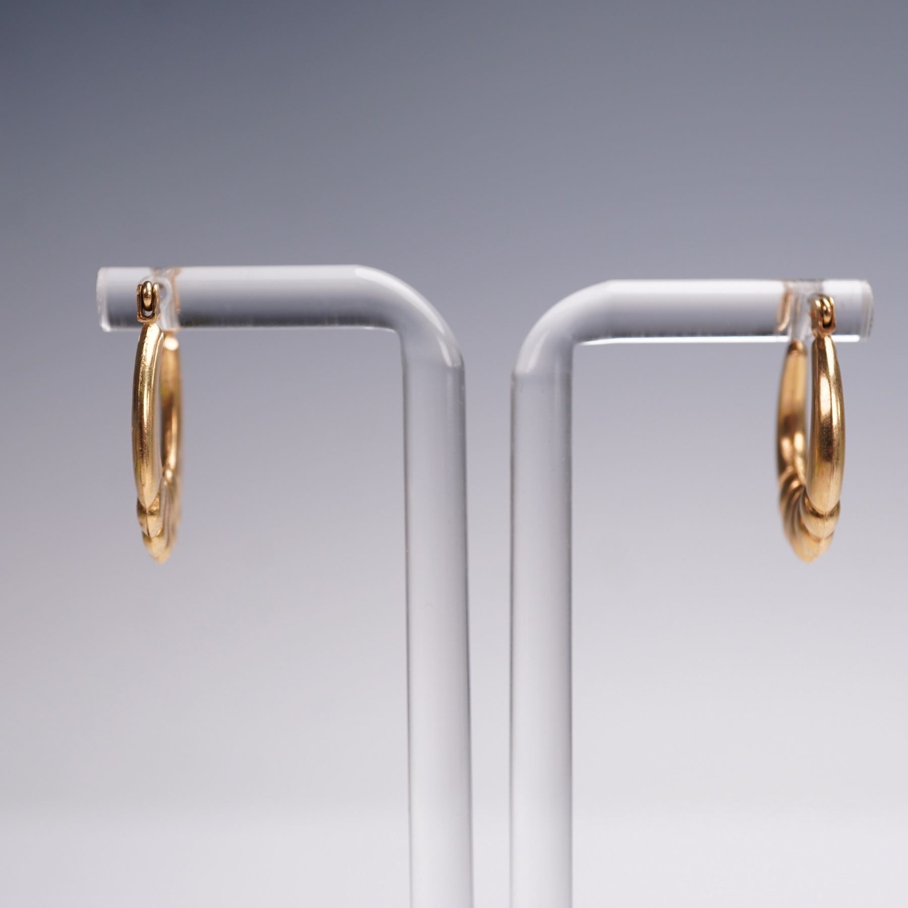 These charming vintage hoop earrings are crafted in warm 14K yellow gold and feature a distinctive ribbed design along the lower curve, adding texture and visual interest. The hoops taper smoothly toward the top, creating a balanced and elegant silhouette. Secure hinged posts provide comfortable wear. Together, the pair has a total weight of approximately 1.4 grams, making them lightweight yet substantial enough to showcase their stylish form. Perfect for everyday wear or as a timeless addition to any jewelry collection, these earrings offer both versatility and a touch of vintage charm. Each earring measures approximately 0.6"W x 0.75"H.