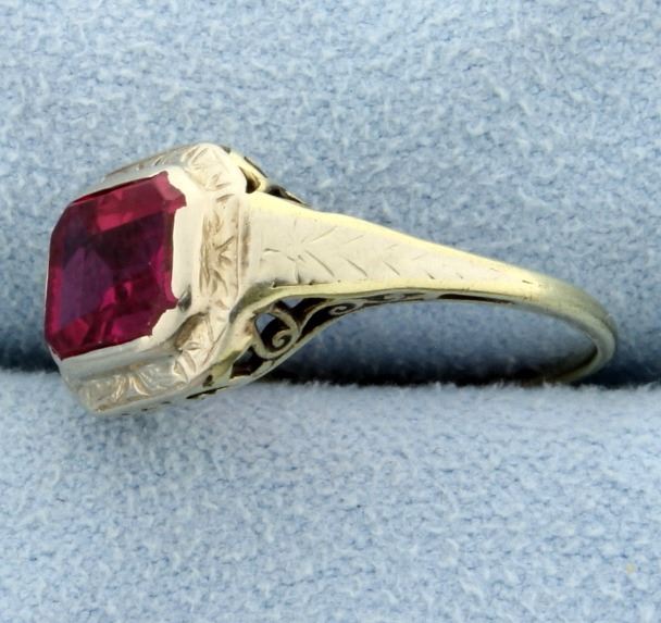 14K yellow gold, there is detailed workmanship on shank. The synthetic ruby is 8.5x7mm. Size 5 1/4 2.4g