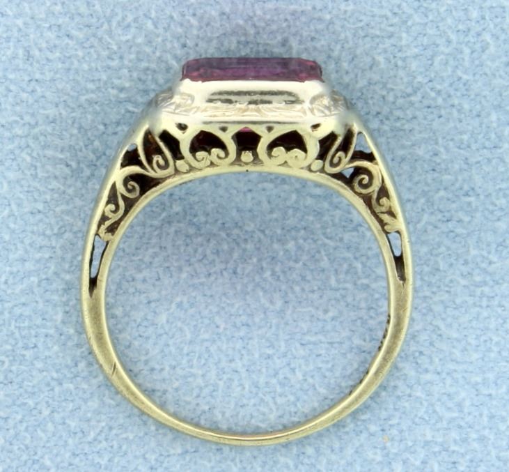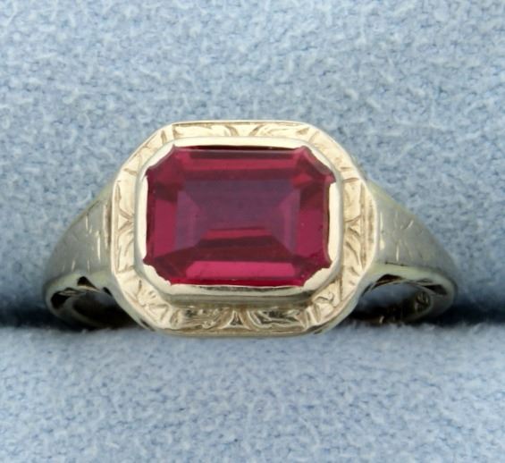 14K yellow gold, there is detailed workmanship on shank. The synthetic ruby is 8.5x7mm. Size 5 1/4 2.4g