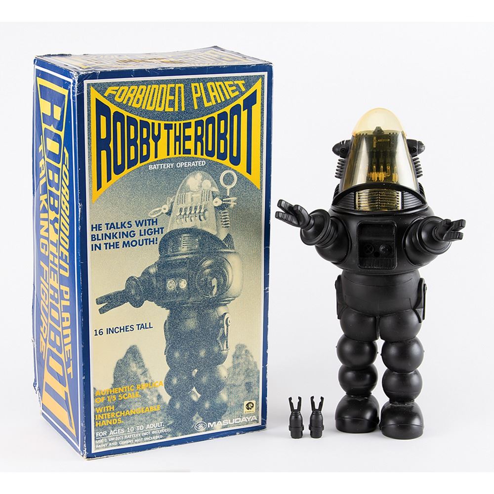 Scarce vintage circa 1980s battery-operated Robby the Robot talking figure, made in Japan by Masudaya, standing at 16Àù tall. The 1/5 scale figure includes interchangeable hands and talks with blinking light in the mouth. Includes its original box. Robby the Robot became a cult sci-fi Hollywood icon after his first appearance in the 1956 film Forbidden Planet.