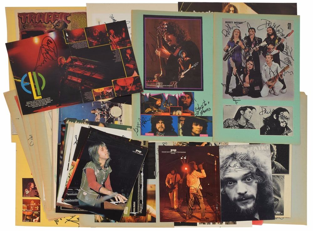 Collection of nearly 50 items signed by various members of classic rock groups, consisting mostly of German magazine photos and articles, with several photos signed multiple times by a musician and/or additional band members, including: Ian Anderson; Art Blakey; Dave Byron (3); John Coughlan; Roger Daltrey; Keith Emerson (3); Ian Gillan; Ken Hensley (3); Dr. Hook and the Medicine Show; Steve Howard; Kings of Rhythm; Denny Laine; Greg Lake; Alan Lancaster; Alvin Lee; Les Humphries Singers; John Mayall; Melanie; Middle of the Road (2); Emerson, Lake, and Carl Palmer (2); Rick Parfitt; Procol Harum (signed on reverse by Jeff Beck and Collosseum II); Suzi Quatro (3); Francis Rossi; Roxy Music (2); Santana (both sides); Carlos Santana and Neal Schon; Status Quo (2, both sides of each); The Sweet (2); Gary Thain; Traffic; Rick Wakeman (2); and Steve Winwood (2). Several photos affixed to slightly larger sheets, with reverse of some bearing additional photos and signatures. In overall very good to fine condition. Consignor notes that these vintage signatures were obtained in person in Vienna during the early to mid-1970s.