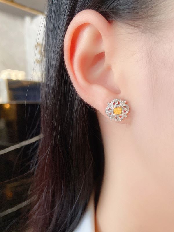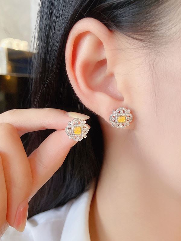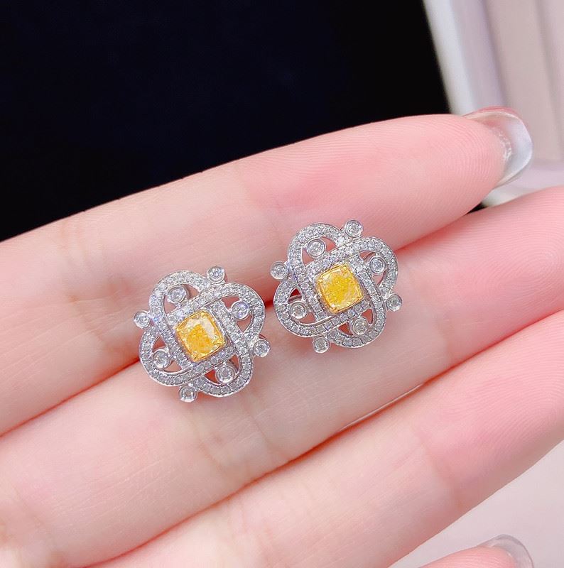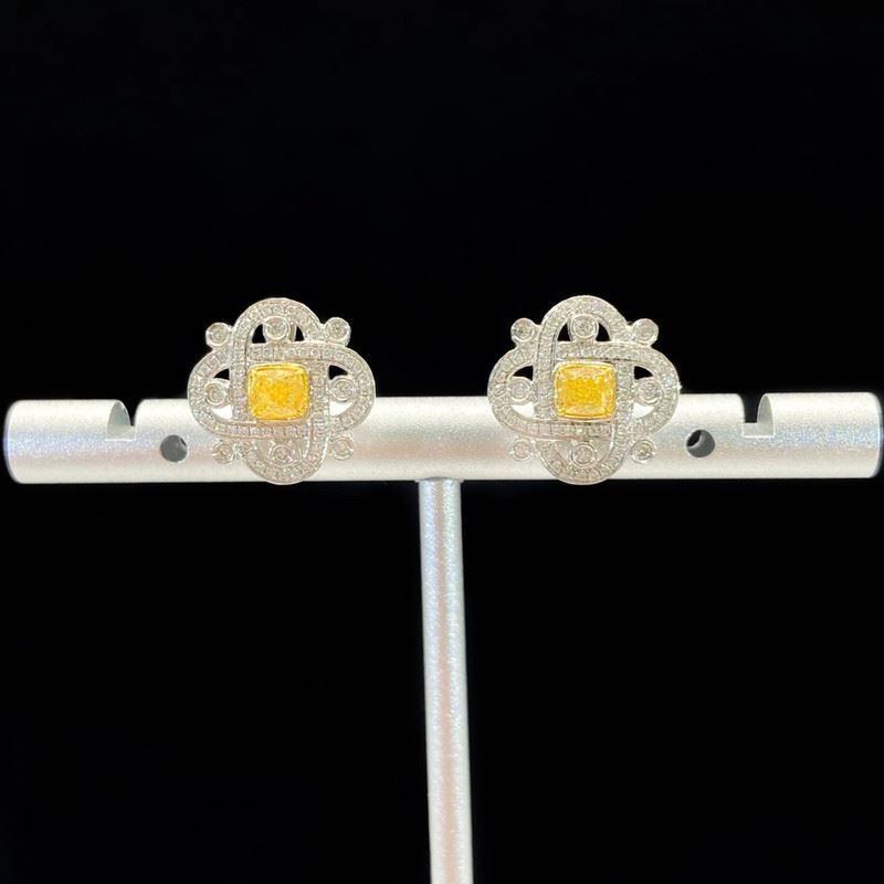 Square yellow diamonds sit at the center of ornate Rococo-inspired scrolls paved with white diamonds. Compact yet striking, these studs blend vintage charm with elegant sparkle. Main diamond: 0.485ct, side diamonds: 0.301 ct. Note: Comes with an AGL certificate and a domestic jewelry identification certificate.