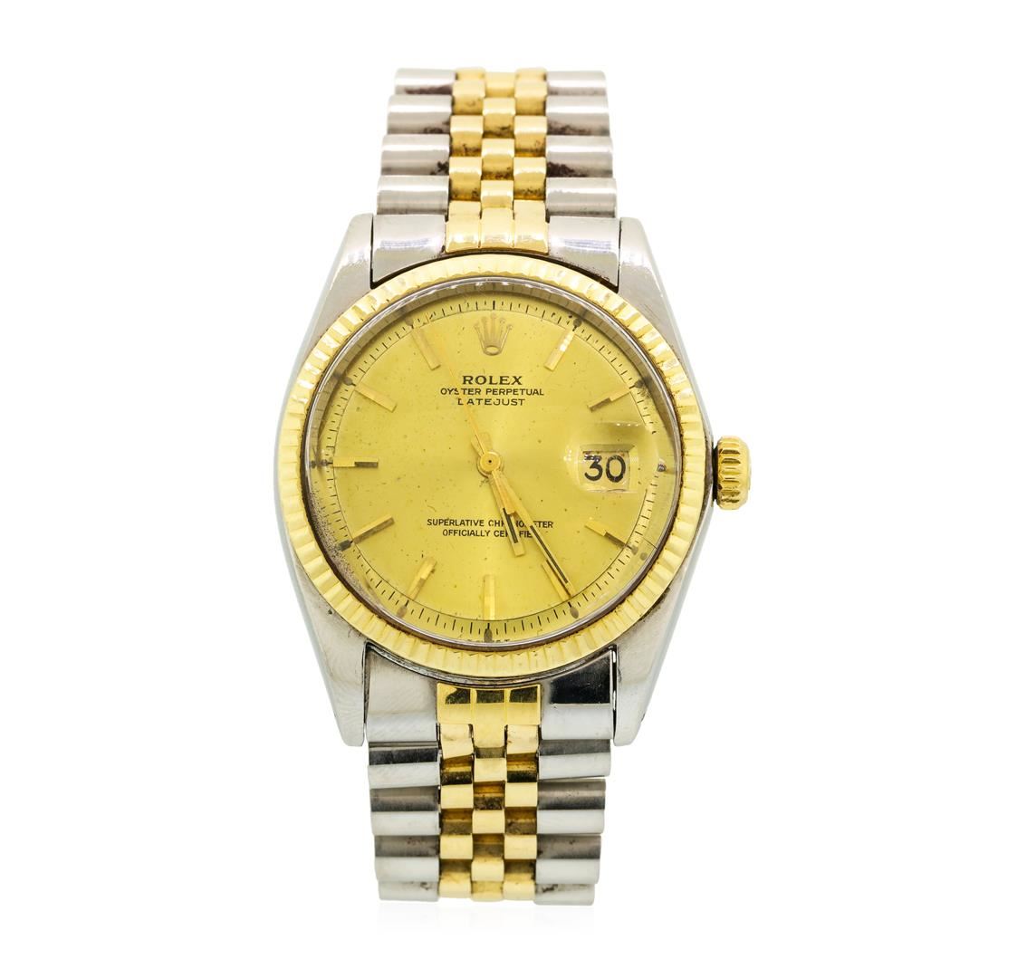 One vintage, hand crafted & machine milled Rolex two-tone DateJust model wristwatch electro-chemically tested. Stainless Steel Case: 36mm oyster, Rolex signature 14KT Yellow gold Crown: twinlock with a high relief logo, 14KT Yellow gold Bezel: fluted, Crystal: acrylic cyclops lens, Circa: 1963.Movement: superlative chronometer, Rolex signed Dial: Champagne color, with baton hands & raised diamond markers, Date Window: 3 o'clock position non-quick set, Rolex Bracelet: two-tone stainless steel & 14KT yellow gold jubilee links, Condition: G-4 Average. Seven inch adjustable length. Rolex USA Hallmarked clasp.The logo and markings on the bracelet clasp are Rolex stampings. In the past, Rolex has produced parts including clasps in locations other than Switzerland. That is why there is a variation to the look; feel, and weight of Rolex parts that were made in different areas of the world. Today, however all parts are produced in Switzerland. The stamping in the clasp of the watch in this appraisal was created for the Rolex market in the U.S.A. between 1960 and 1975.Total Weight of Watch 83.87gm. AIG Appraised at $6,050.00.