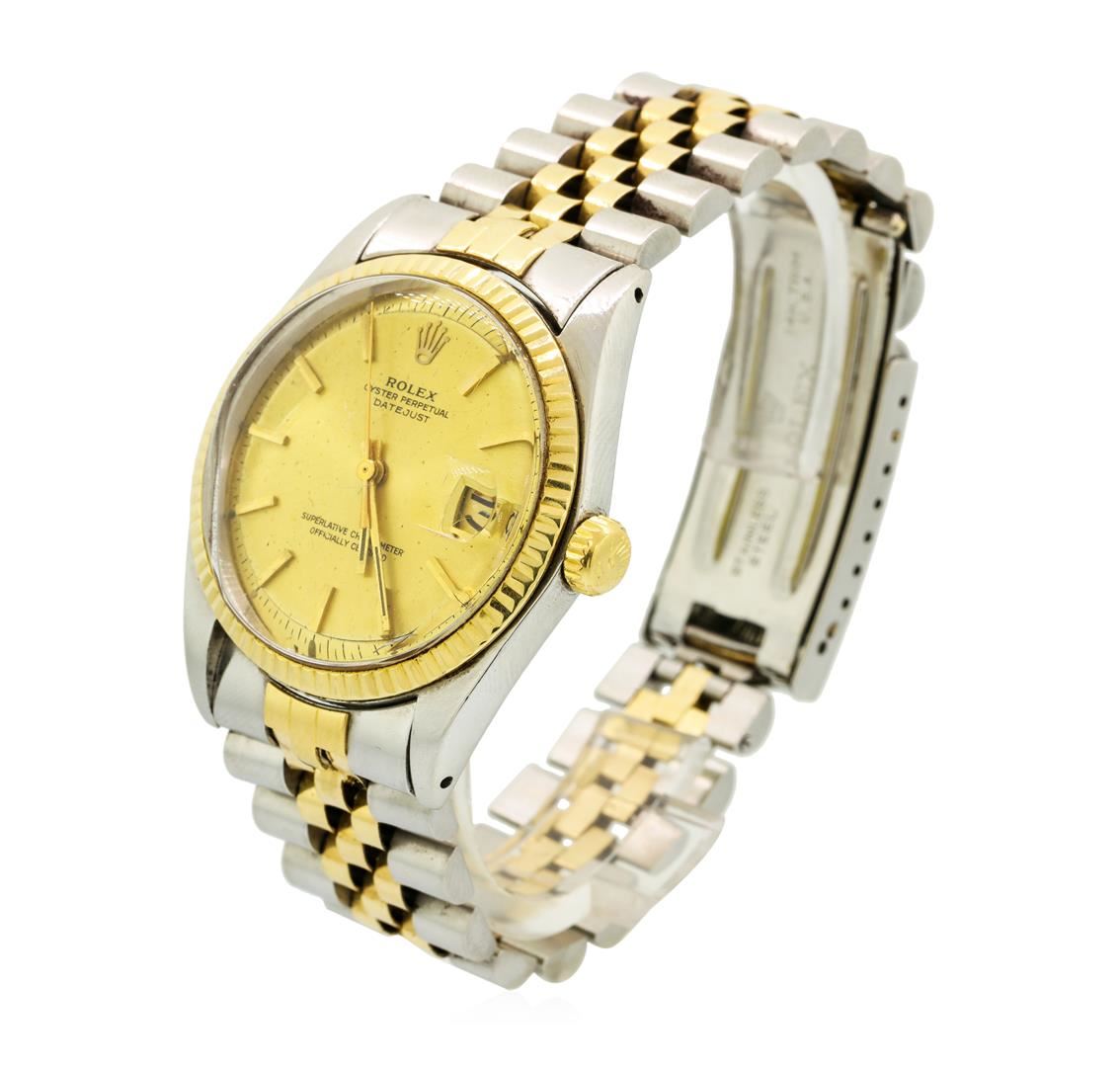 One vintage, hand crafted & machine milled Rolex two-tone DateJust model wristwatch electro-chemically tested. Stainless Steel Case: 36mm oyster, Rolex signature 14KT Yellow gold Crown: twinlock with a high relief logo, 14KT Yellow gold Bezel: fluted, Crystal: acrylic cyclops lens, Circa: 1963.Movement: superlative chronometer, Rolex signed Dial: Champagne color, with baton hands & raised diamond markers, Date Window: 3 o'clock position non-quick set, Rolex Bracelet: two-tone stainless steel & 14KT yellow gold jubilee links, Condition: G-4 Average. Seven inch adjustable length. Rolex USA Hallmarked clasp.The logo and markings on the bracelet clasp are Rolex stampings. In the past, Rolex has produced parts including clasps in locations other than Switzerland. That is why there is a variation to the look; feel, and weight of Rolex parts that were made in different areas of the world. Today, however all parts are produced in Switzerland. The stamping in the clasp of the watch in this appraisal was created for the Rolex market in the U.S.A. between 1960 and 1975.Total Weight of Watch 83.87gm. AIG Appraised at $6,050.00.