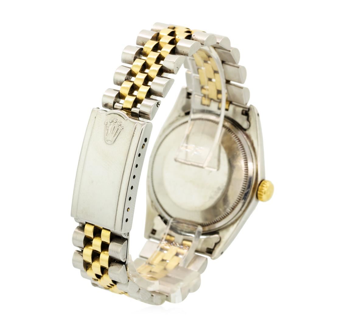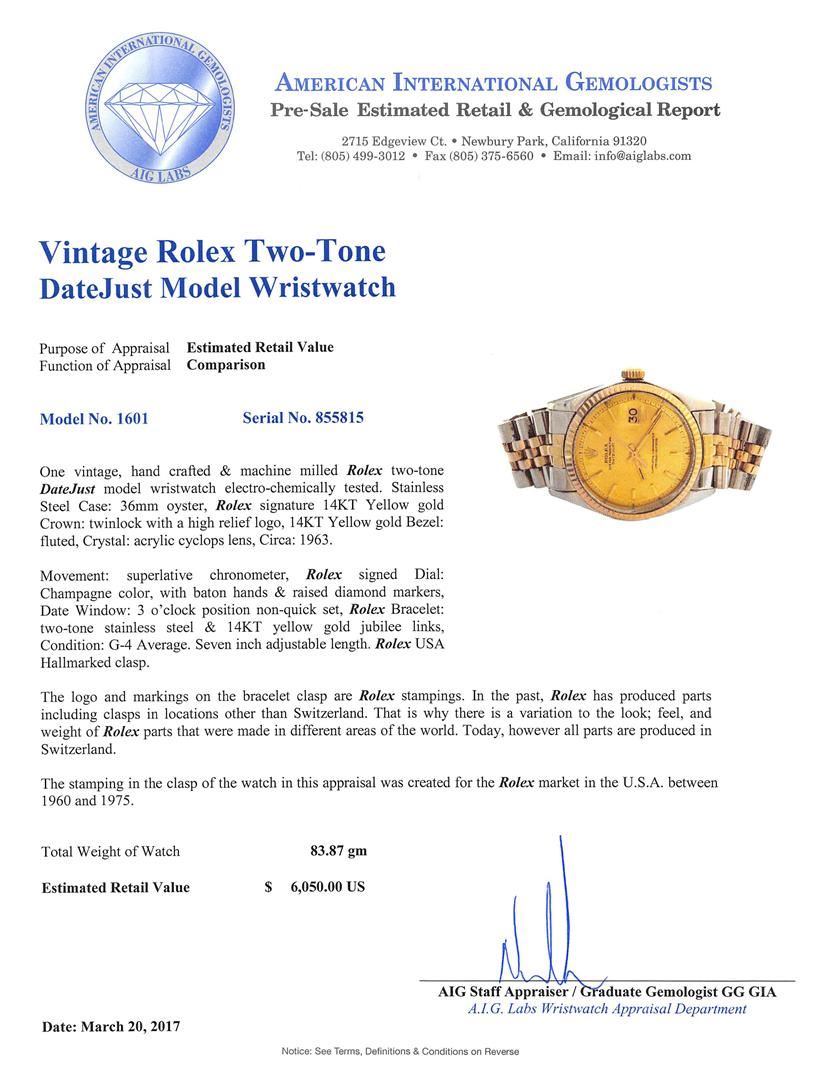 One vintage, hand crafted & machine milled Rolex two-tone DateJust model wristwatch electro-chemically tested. Stainless Steel Case: 36mm oyster, Rolex signature 14KT Yellow gold Crown: twinlock with a high relief logo, 14KT Yellow gold Bezel: fluted, Crystal: acrylic cyclops lens, Circa: 1963.Movement: superlative chronometer, Rolex signed Dial: Champagne color, with baton hands & raised diamond markers, Date Window: 3 o'clock position non-quick set, Rolex Bracelet: two-tone stainless steel & 14KT yellow gold jubilee links, Condition: G-4 Average. Seven inch adjustable length. Rolex USA Hallmarked clasp.The logo and markings on the bracelet clasp are Rolex stampings. In the past, Rolex has produced parts including clasps in locations other than Switzerland. That is why there is a variation to the look; feel, and weight of Rolex parts that were made in different areas of the world. Today, however all parts are produced in Switzerland. The stamping in the clasp of the watch in this appraisal was created for the Rolex market in the U.S.A. between 1960 and 1975.Total Weight of Watch 83.87gm. AIG Appraised at $6,050.00.