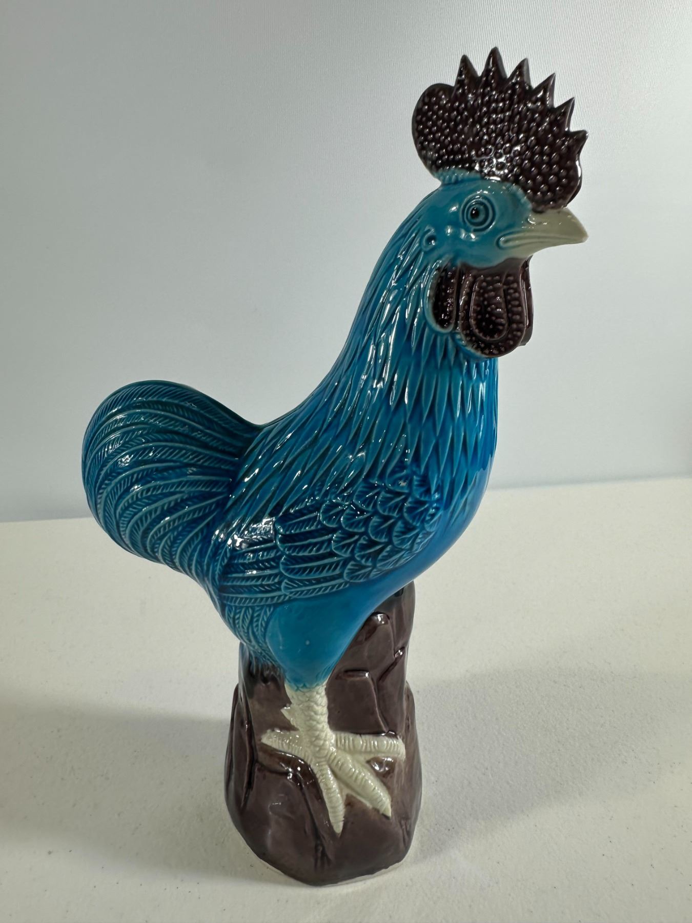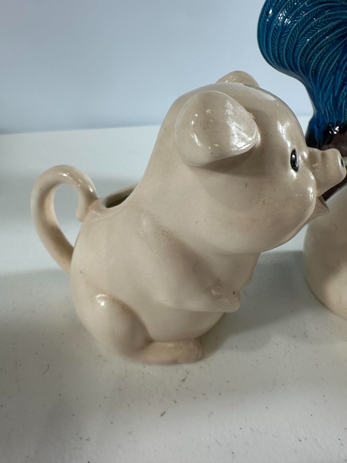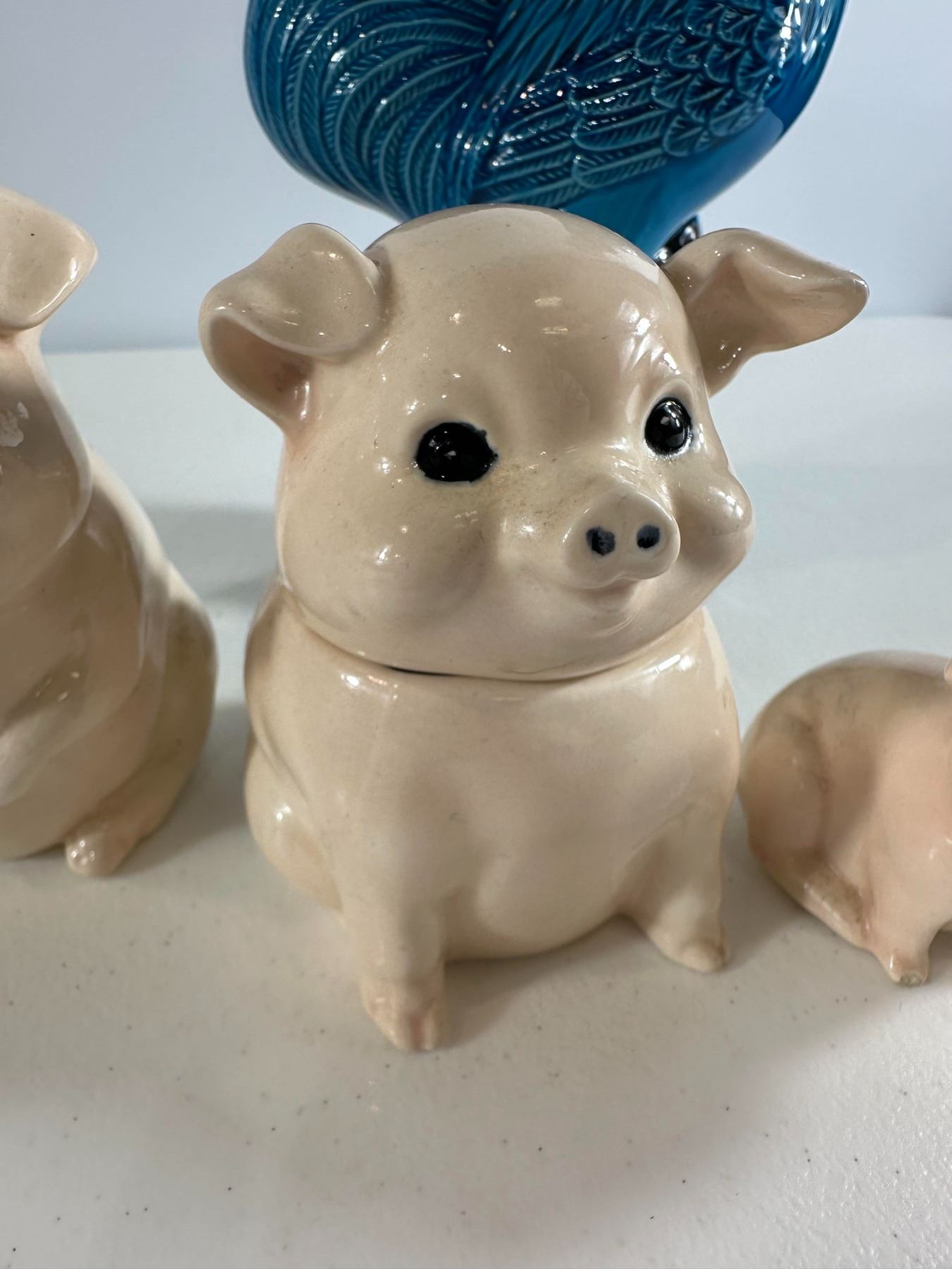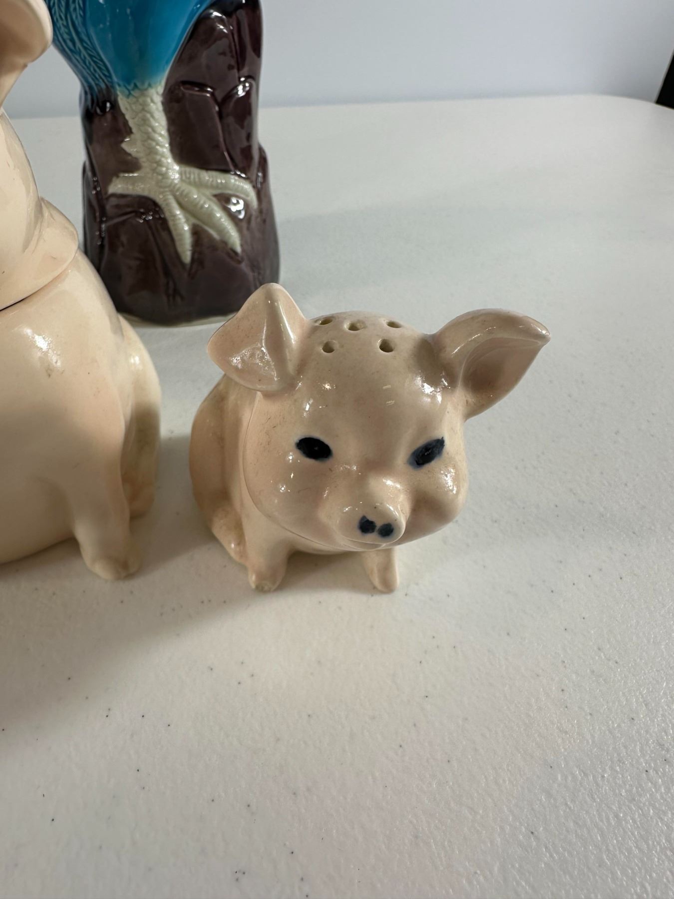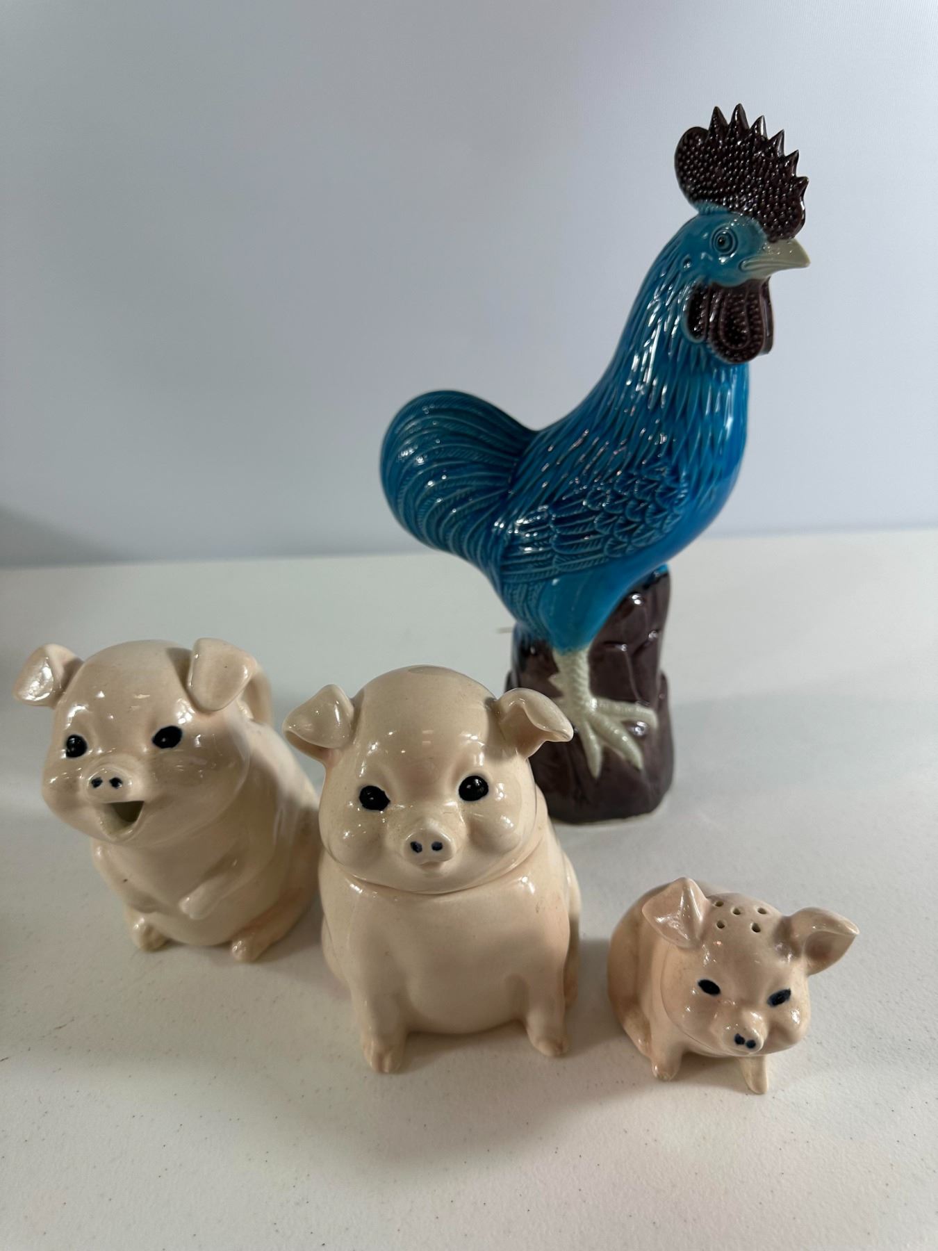 Bright blue rooster figure paired with three matching pig pieces (lidded jar, open sugar/creamer and shaker). Country 'kitchen cute; light wear.