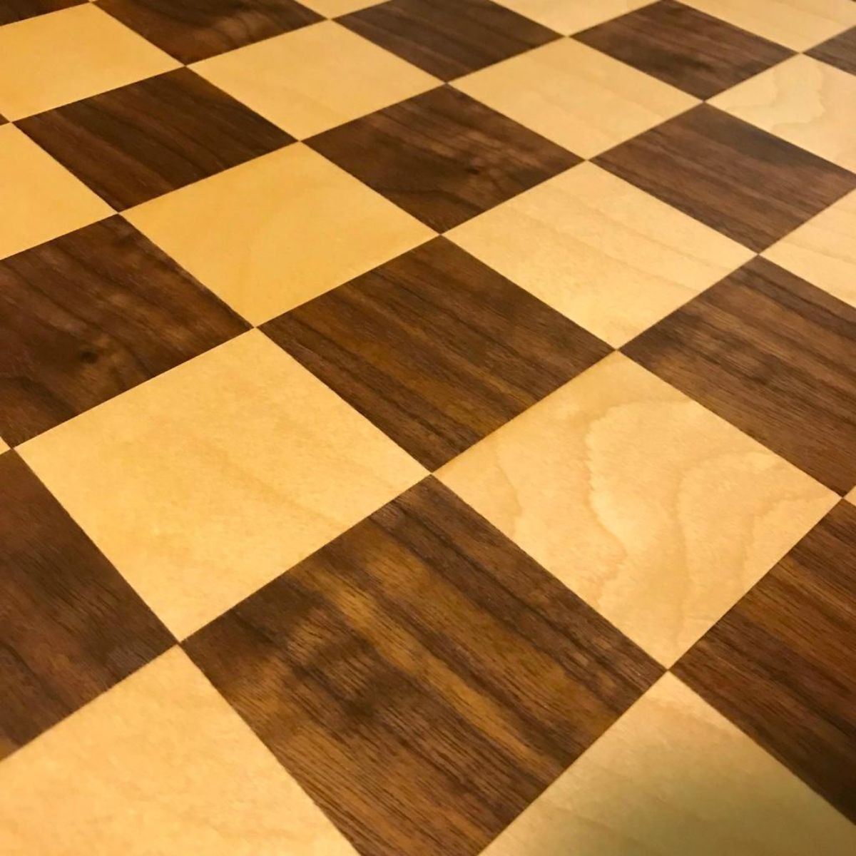 Vintage rosewood & maple inlaid chess board with 60mm squares. 22 1/2" X 22 1/2" square. 1/2" thick. In good, unused condition, per photos.