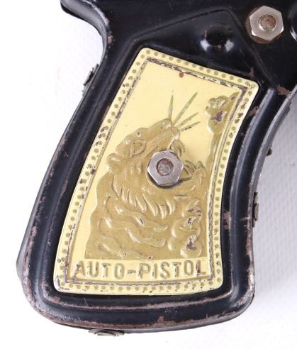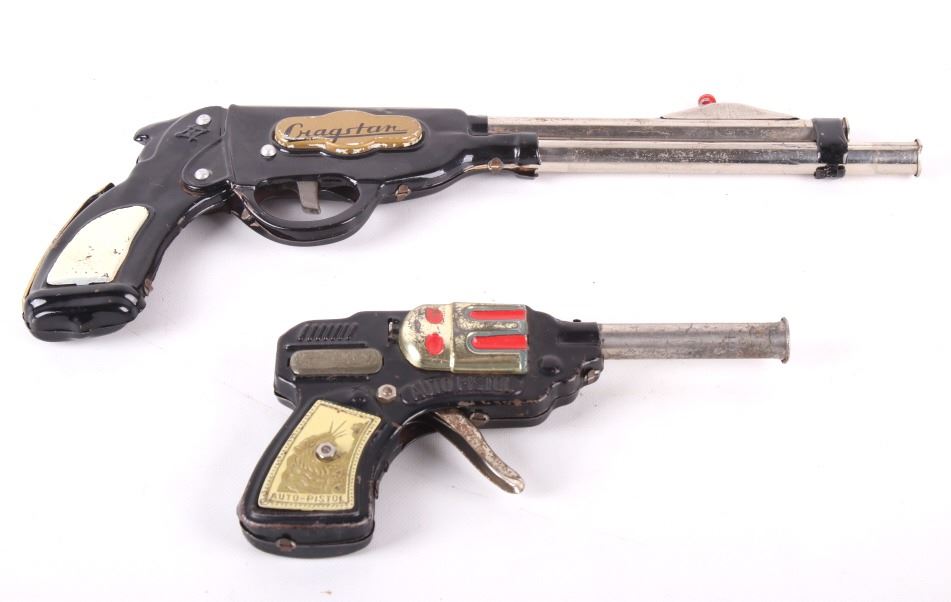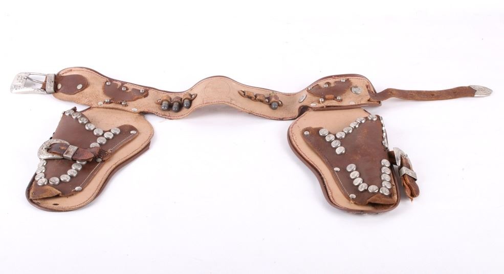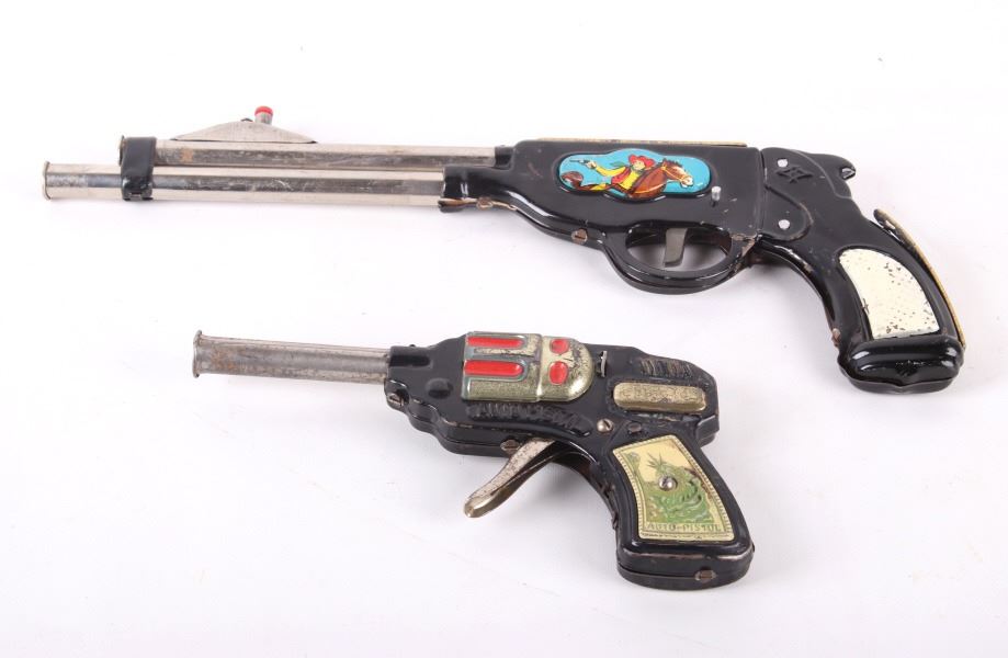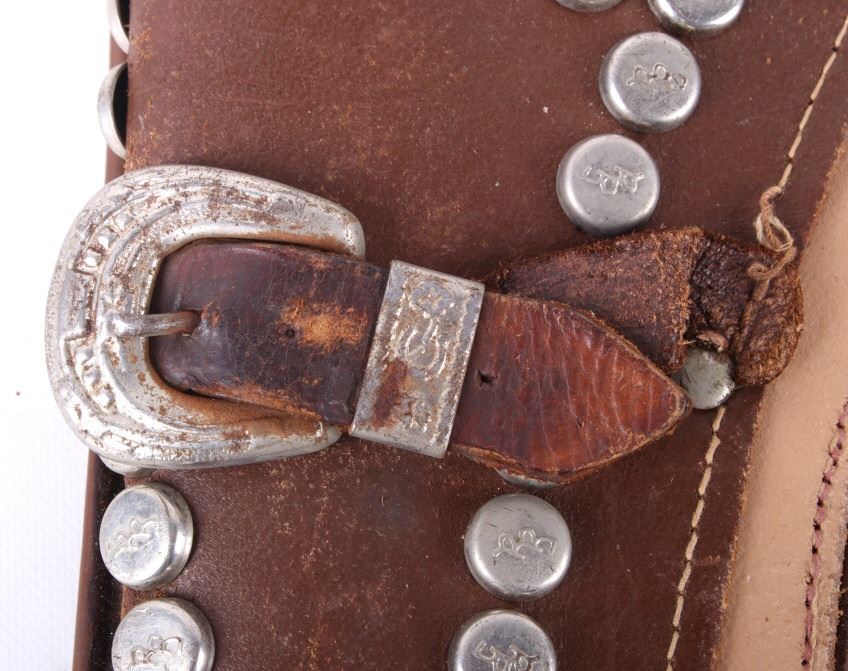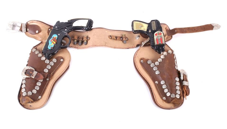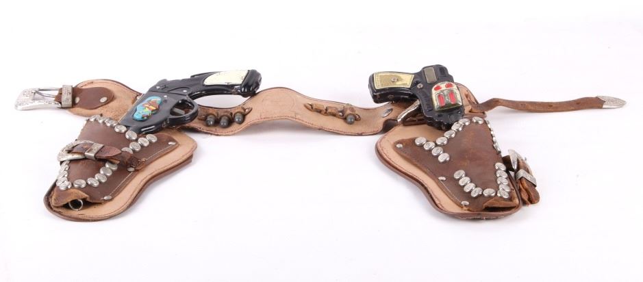 Featured in this lot is a vintage (1950's-60's) Western toy collection that includes a vintage Roy Rogers Double Gun Holster, a Cragstan tin toy pistol, and one additional toy auto-pistol. Roy Rogers was an American singer and actor. He was one of the most popular Western stars of his era. Known as the "King of the Cowboys", he appeared in over 100 films and numerous radio and television episodes of The Roy Rogers Show (Wikipedia). The holster buckle and studs are marked with the "RR" logo. It also comes with toy bullets. The holster measures 26" wide with belt and 11" long with gun holsters. The toys are in good condition for age (wear showing).