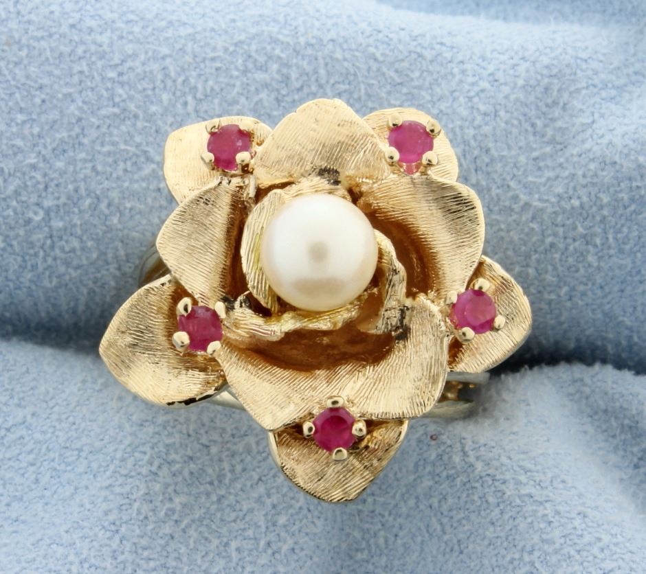 The pearl in center is 6.25mm. There are 5 - 2.5mm ruby gemstones. The ring is 14k yellow gold and size 7. 13.5g