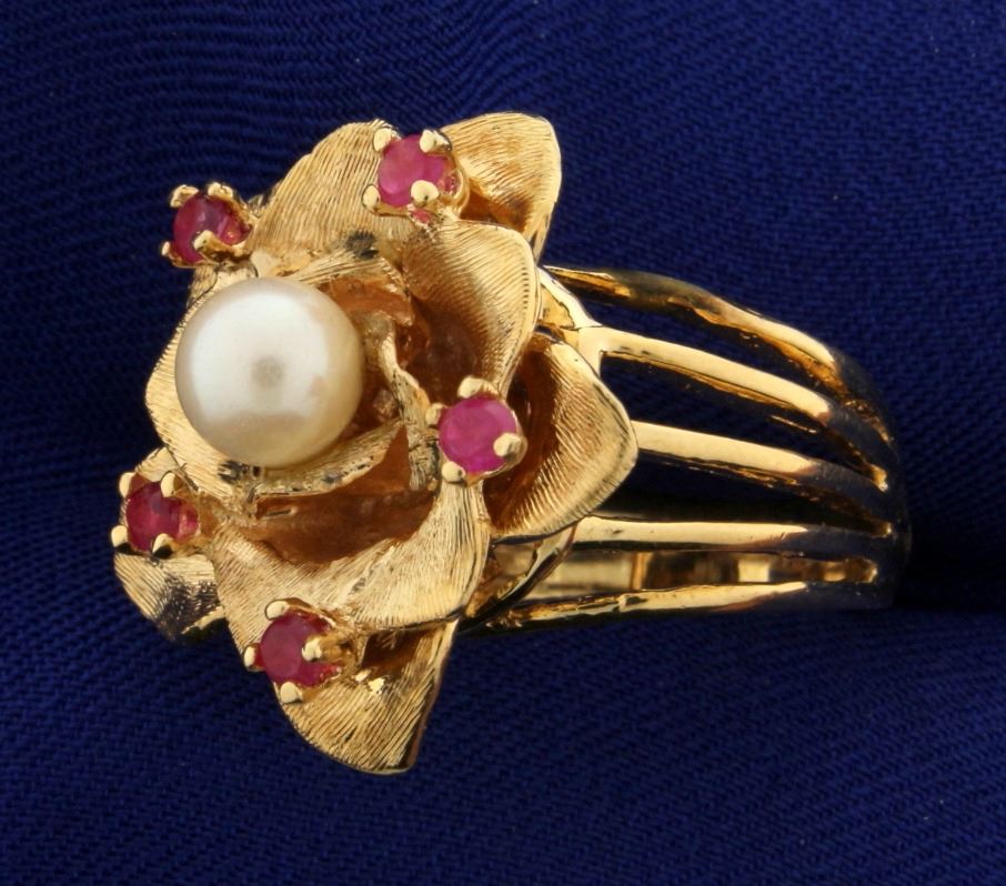 In 14k Yellow gold. The pearl in center is 6.25mm with excellent luster and color. Also contains five 2.5mm ruby gemstones with bright red color and excellent clarity. Size 7. 13.5g