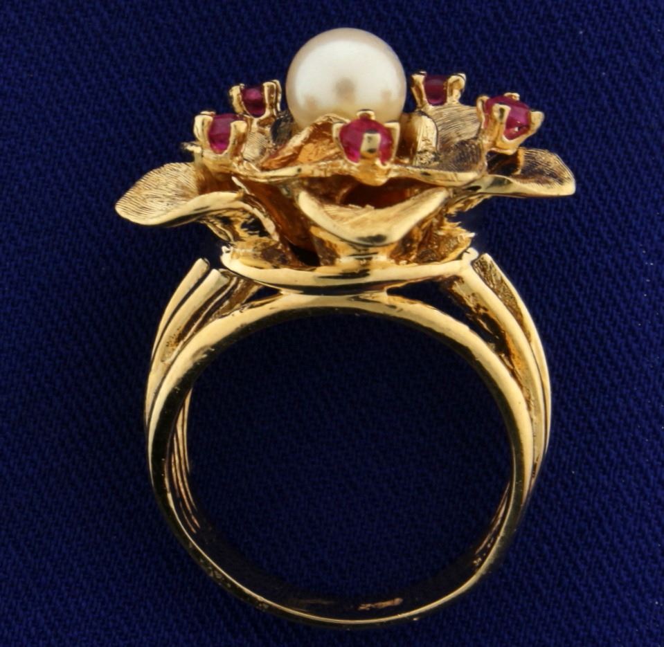 In 14k Yellow gold. The pearl in center is 6.25mm with excellent luster and color. Also contains five 2.5mm ruby gemstones with bright red color and excellent clarity. Size 7. 13.5g