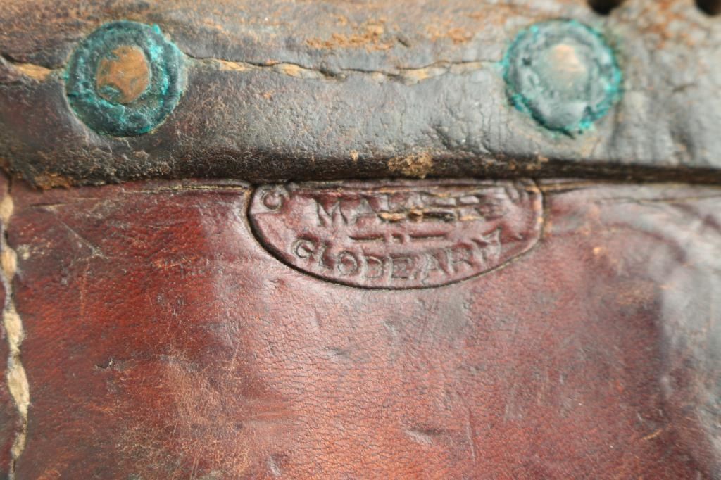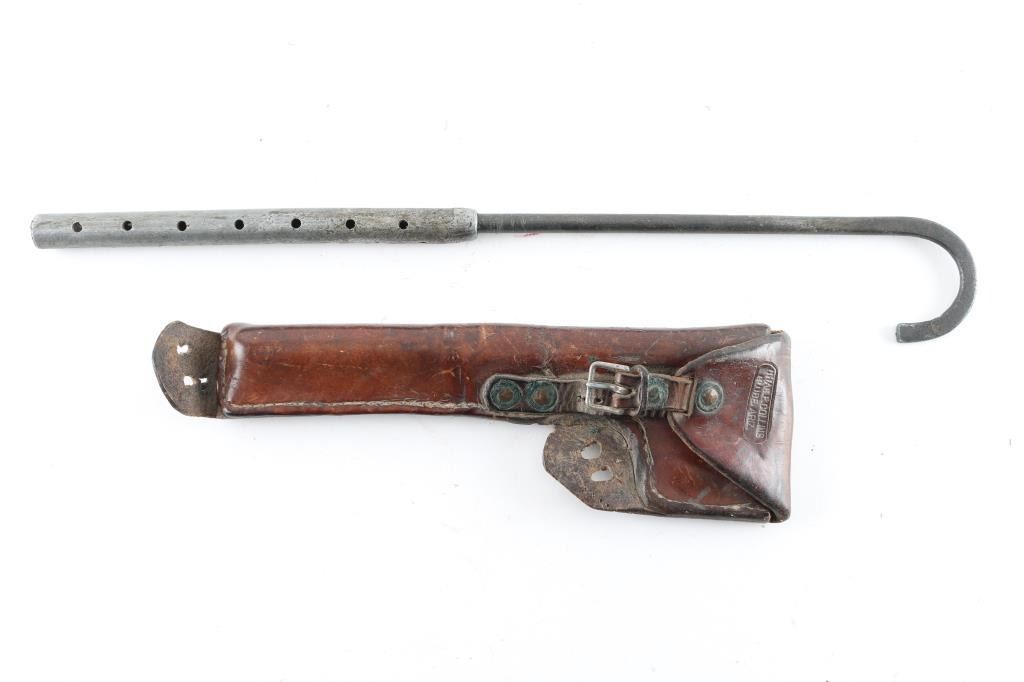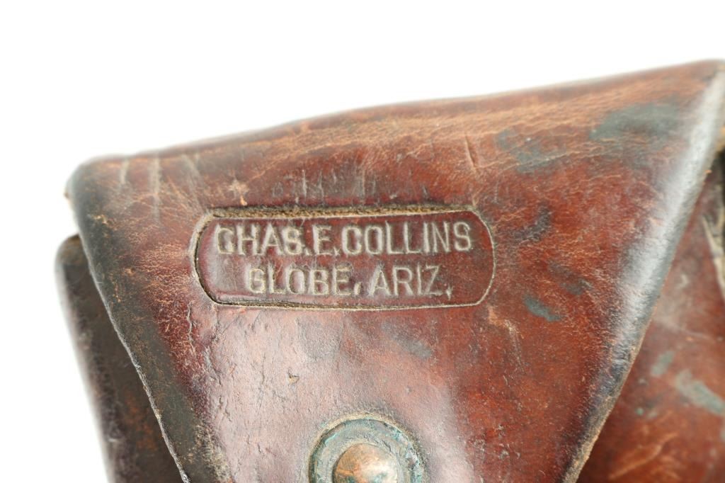 The Running Iron was used to modify brands on cattle or other animals to match a different brand or to hide a previous owner's mark. The hook shape could be used for a variety of shapes. The ventilated handle unscrews, and is attached in reverse to provide longer reach and less heat. The custom fitted leather case is marked "CHAS E COLLINS / GLOBE ARIZ", in overall good condition, with places where thongs can be used to attach to other gear. The Iron is overall very good condition.