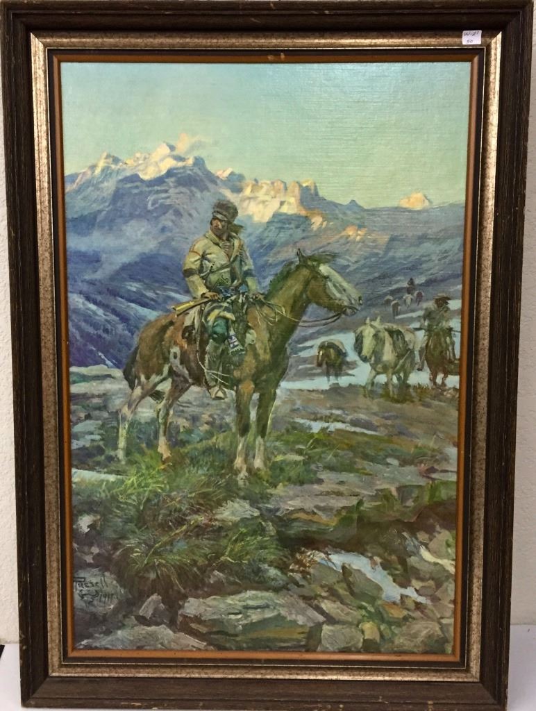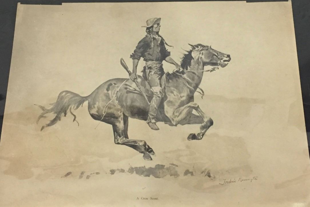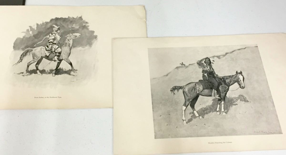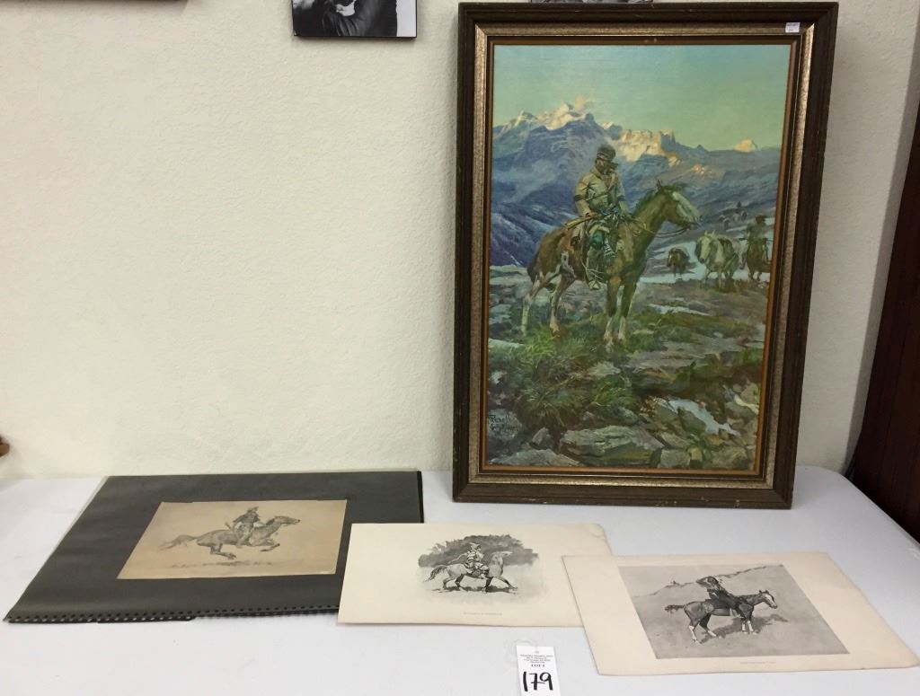The Russell print is a canvas transfer and is framed. It measures 24.5” x 34.5” including frame. The other 3 Remington prints are 17.5” x 11.5” and 13" x 10". These are older pieces and show a little age. Please look closely at the pics as they are an important part of our description. Shipping: There will be a $10 handling / packaging fee for shipping this lot. The actual cost of postage will be added on top of that.