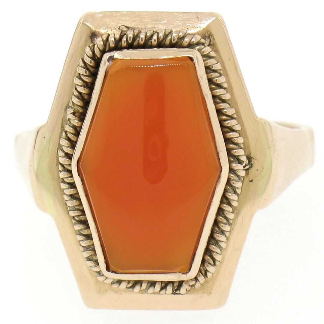 An excellent condition, vintage, Russian-made ring bezel set with a hexagonal cabochon cut carnelian measuring 14.0x9.25mm. The ring is a size 9, weighs a total of 7.10 grams, and is 20.15mm wide.