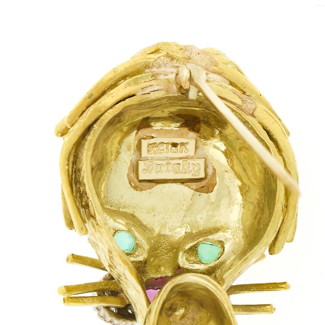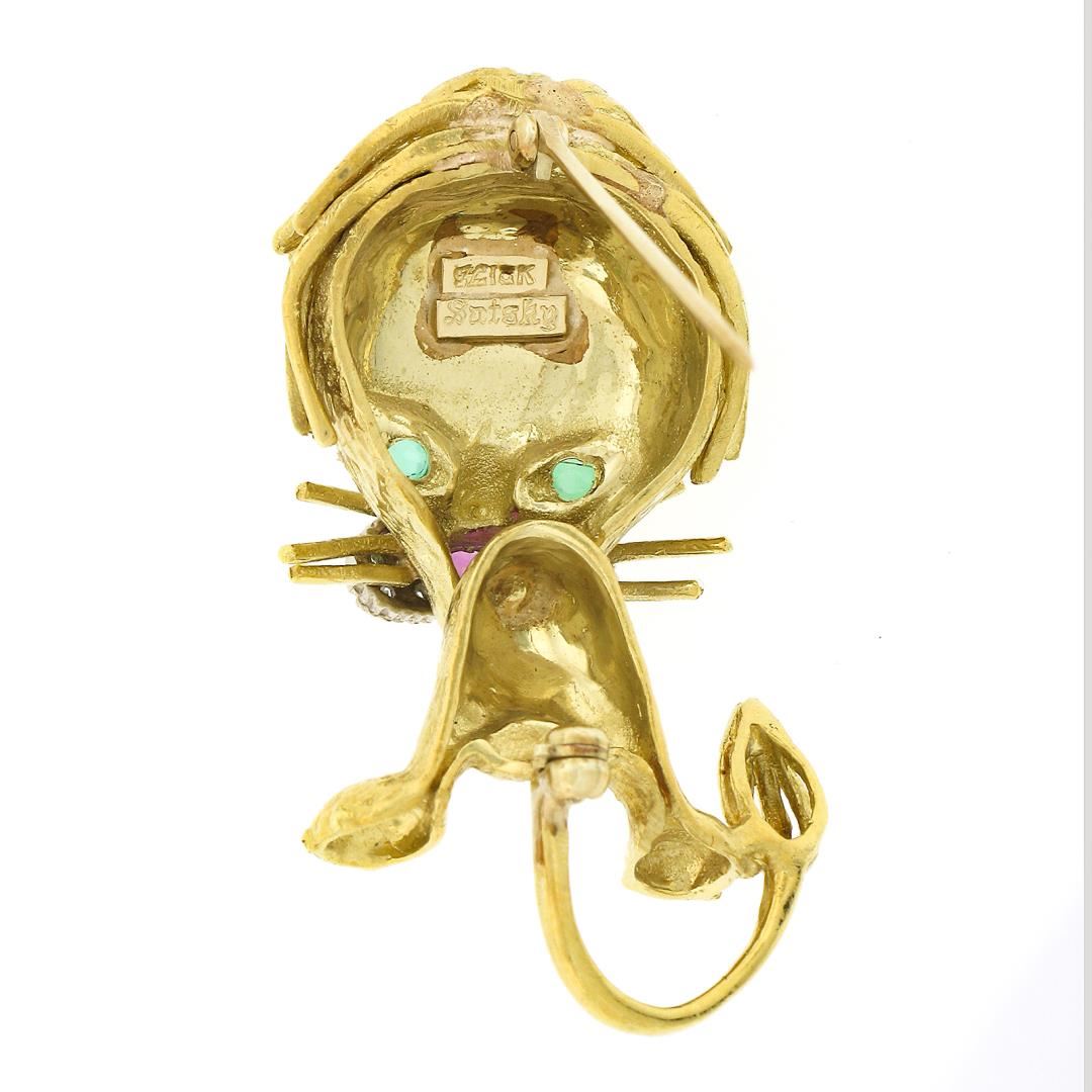 A solid 18k yellow & white gold lion brooch by Ruth Satsky, with 2 round brilliant cut natural emeralds (0.24ctw), 1 oval cut natural tourmaline (4.2x3.3mm / 0.22ct ), and 12 old single cut natural diamonds (F/G - VS1/VS2 ; 0.20ctw). Measures 44.75x23.90mm and weighs a total of 20.38 grams.