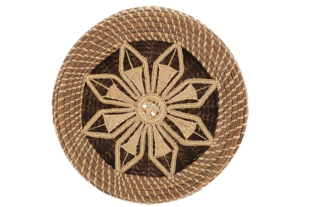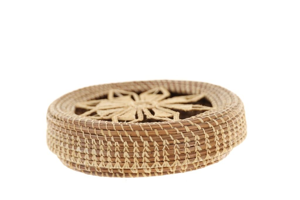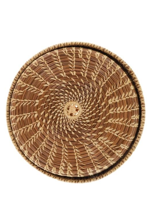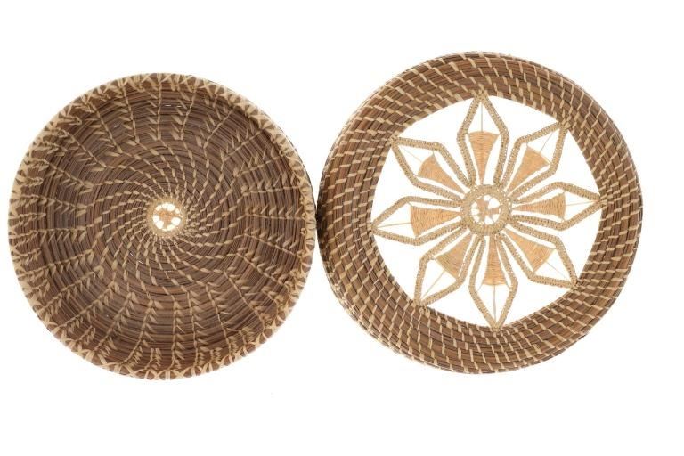 The lot features a Salish woven pine needle intricately woven lidded basket with vintage age attributed to Christel Kwaterowsky from Saanich of the Vancouver Island of Canada. The piece shows a lidded round basket with intricate floral open lid and bottom. The piece is very well kept and displays beautifully. Measures overall 6.5-inch diameter by 2-inches high.