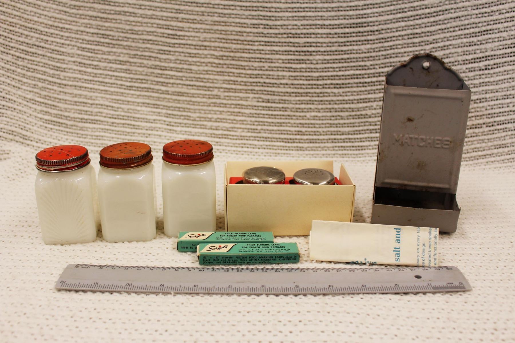 Vintage Salt and Peppers Shakers, Match Box and Marking Lead