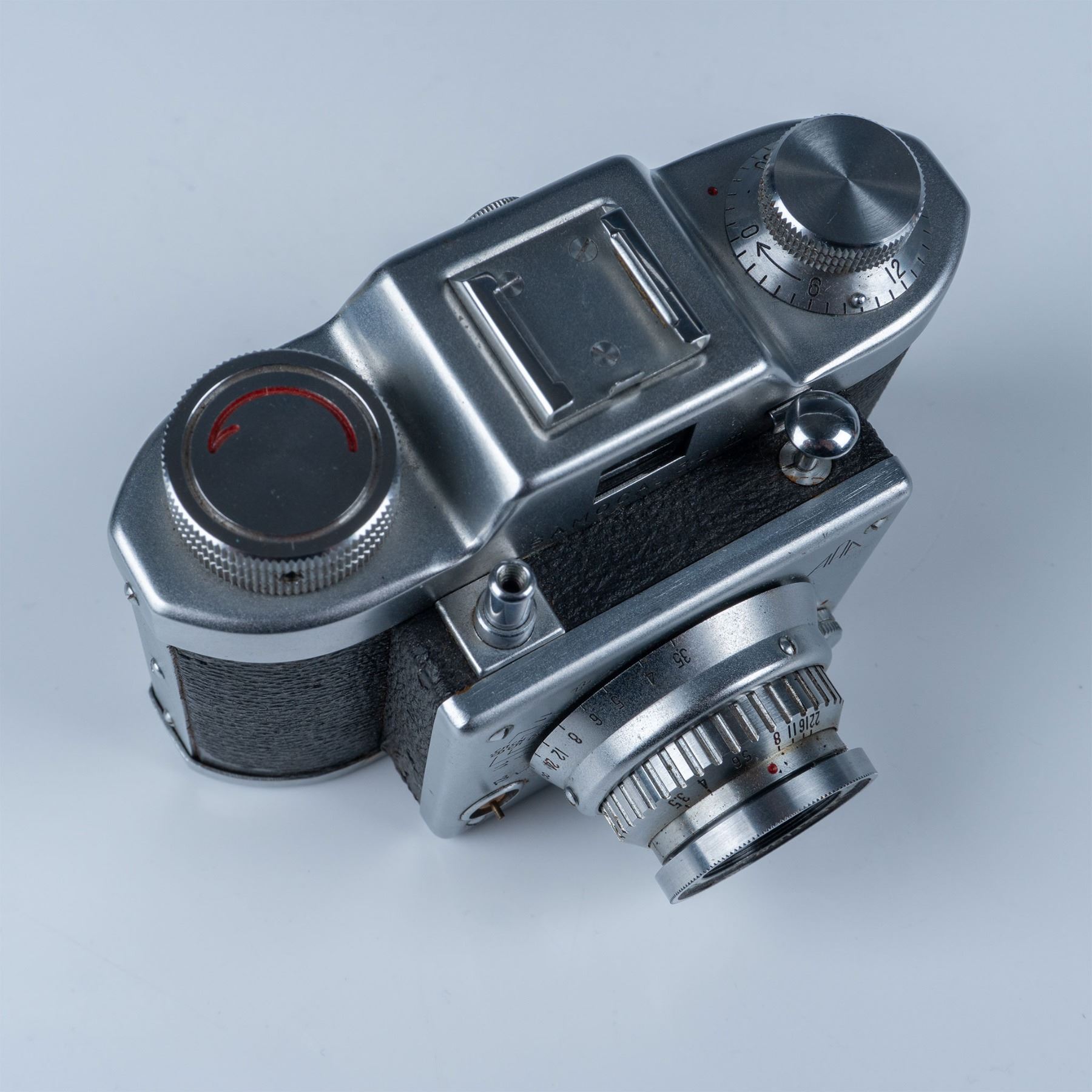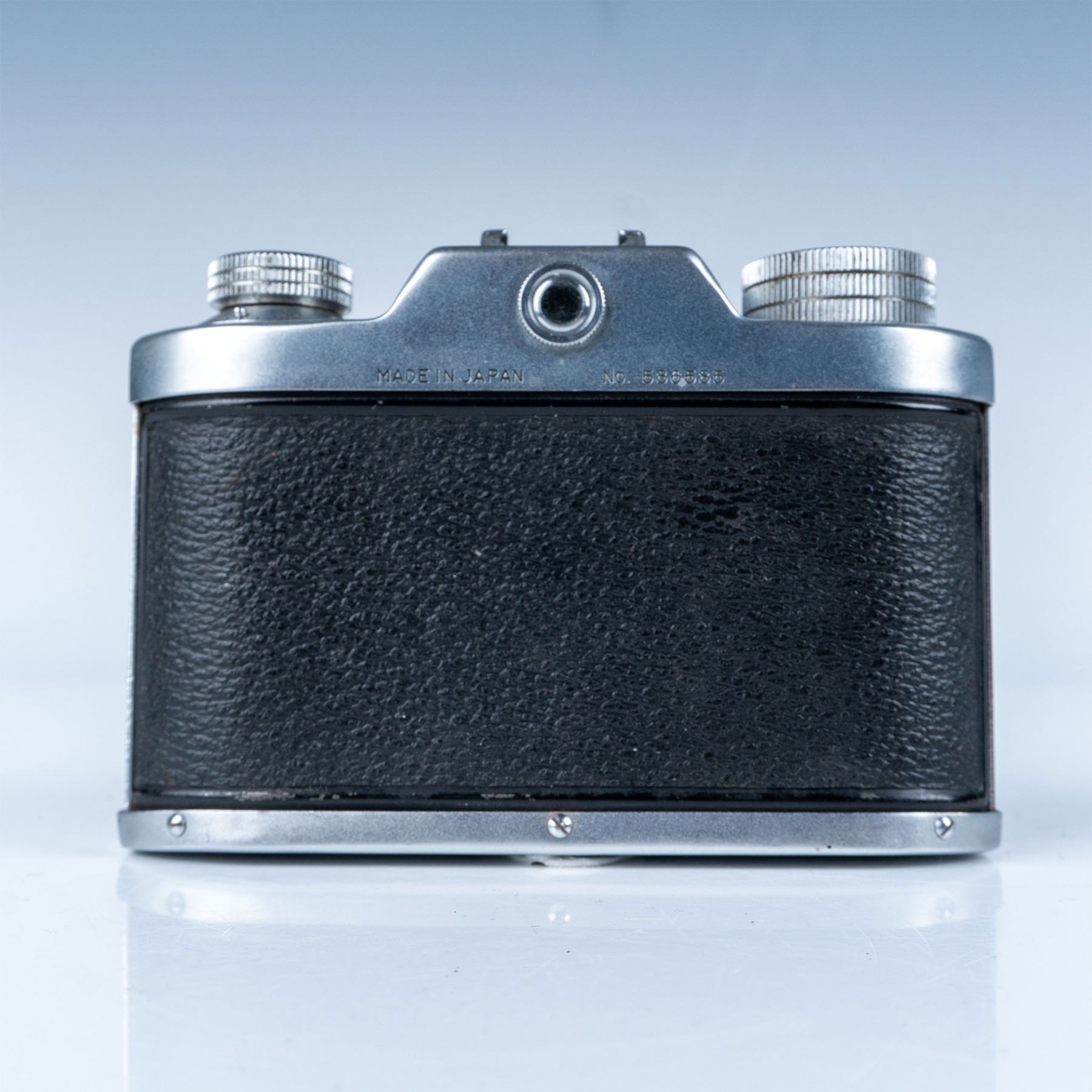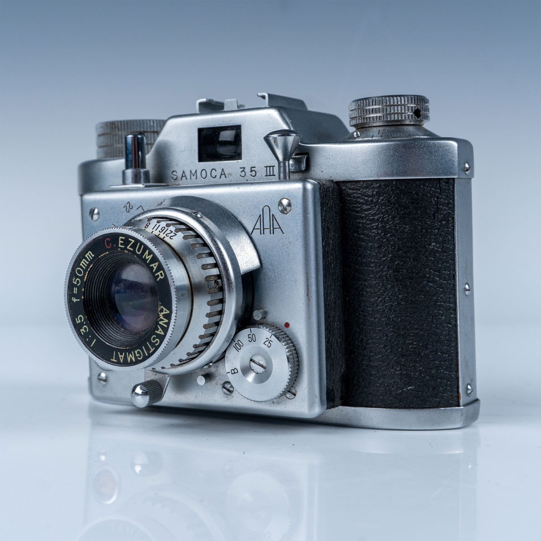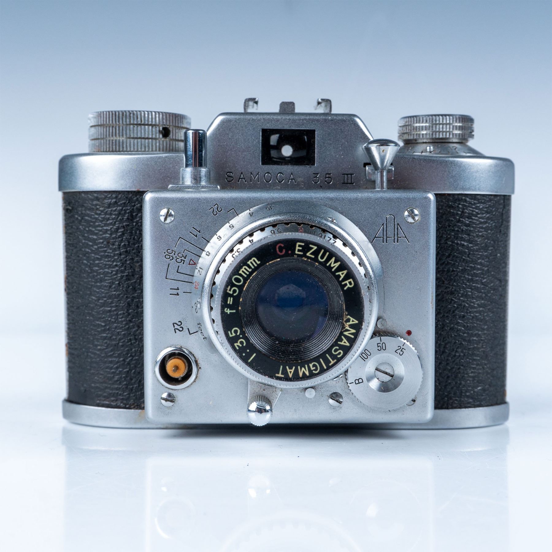 This vintage Samoca 35mm camera is a prime example of mid-20th century Japanese camera craftsmanship. Manufactured by Samoca, a brand renowned for its innovative compact cameras in the post-war era, this particular model features an Anastigmat 50mm f/3.5 lens with precise manual focusing capabilities. The camera boasts a sleek metal body with a textured black leatherette finish for improved grip and aesthetic appeal. Its top dials and control system highlight the detailed engineering that made Samoca cameras a favorite among hobbyists and photographers seeking a reliable and portable option. Serial number: 586585.