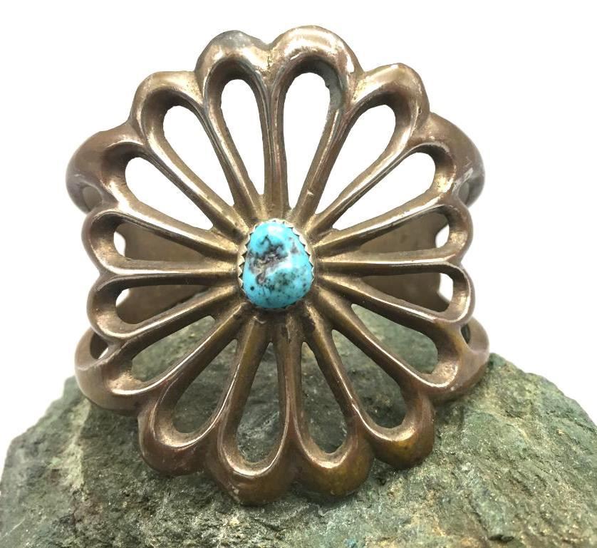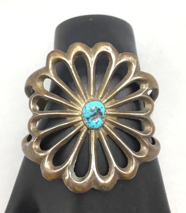 For your consideration we offer this vintage sterling silver sandcast bracelet featuring a single turquoise cabochon in the center of the design. Maker: Unmarked. Approx. Age: 1970s. Size: Measures 5-3/4" with a 1" opening, fits a 6-3/4" wrist. It is 2-3/8" wide and weighs 46.1 grams. Condition: Good for its age, normal wear expected. Please look closely at the pictures - they are an important part of our description. Shipping: There will be a $5 handling, packaging fee for shipping this lot. The actual cost of postage will be added on top of that.