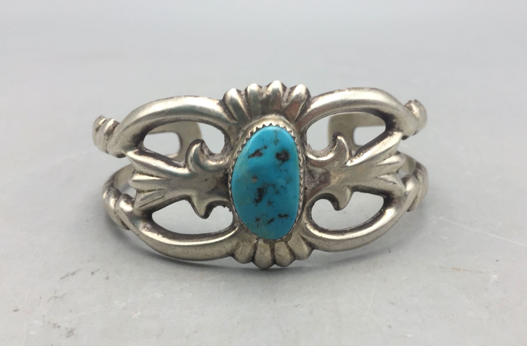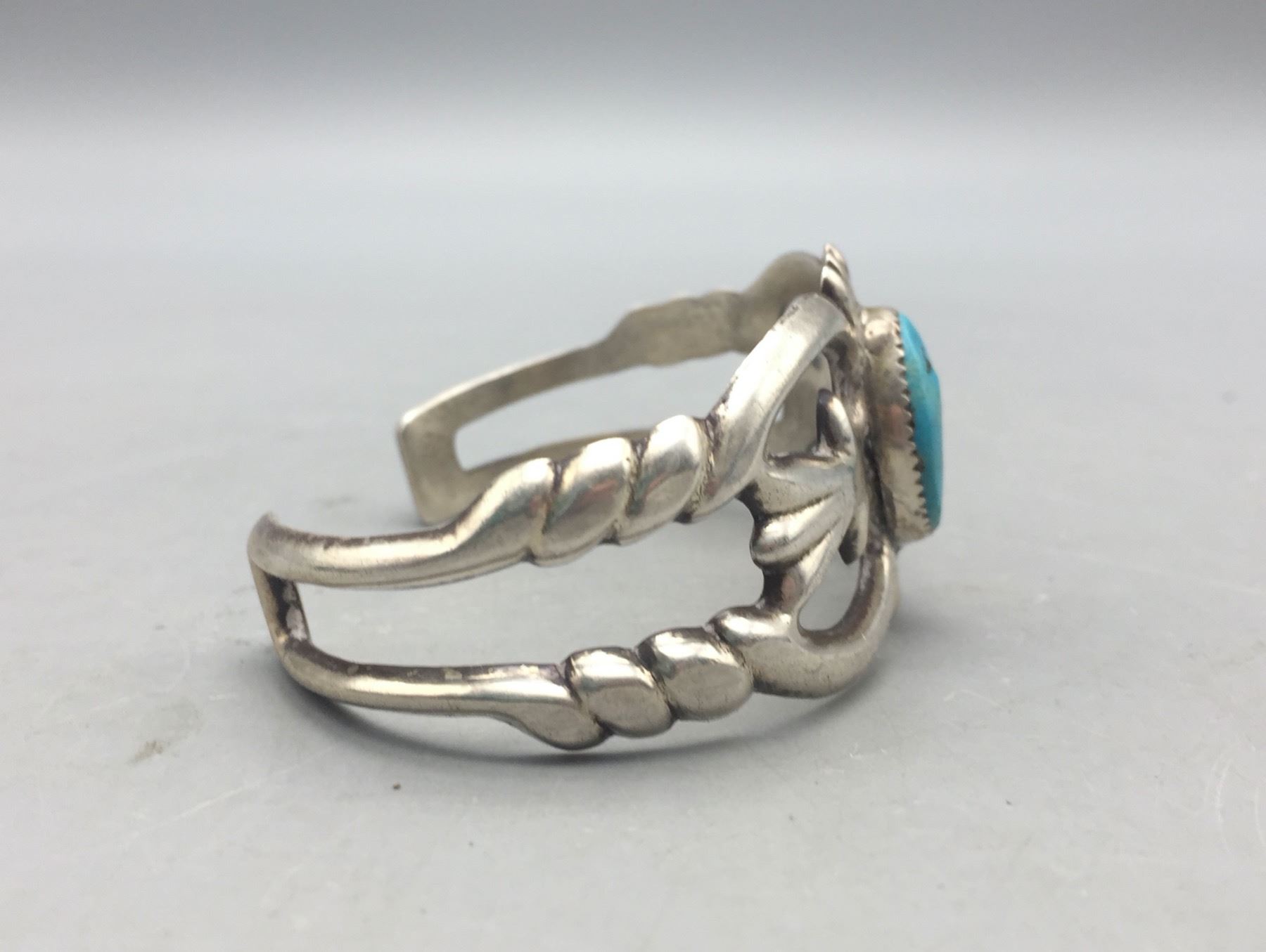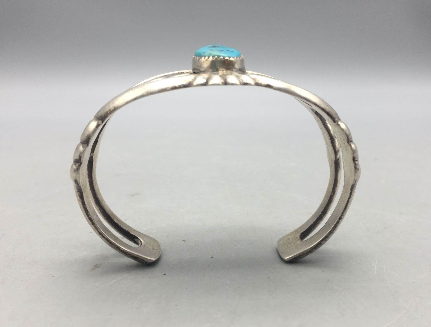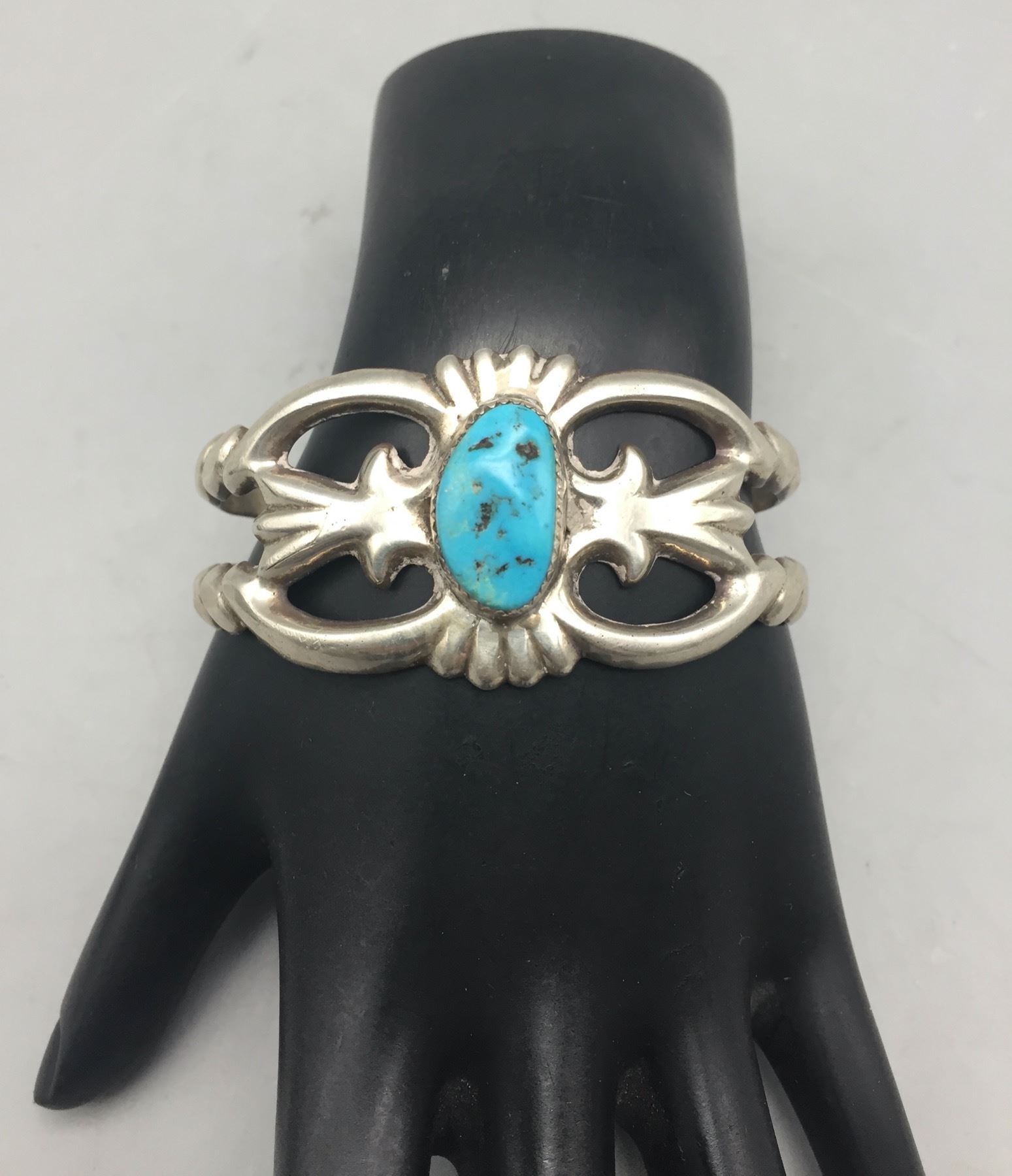 Description: For sale in this lot we have a beautiful, vintage sandcast bracelet featuring a bright turquoise stone. Marked as sterling silver. Maker: Unmarked. Approx. Age: Vintage. Size: Inside circumference measures 5-5/8 inches. Opening is an additional 1-1/4 inches, fitting a 6-7/8 inch wrist. Width is 1-1/4 inches. Weighs 44.2 grams. Condition: Good for its age, normal wear expected. Please look closely at the pictures - they are an important part of our description. Shipping: There will be a $5 handling, packaging fee for shipping this lot. The actual cost of postage will be added on top of that.