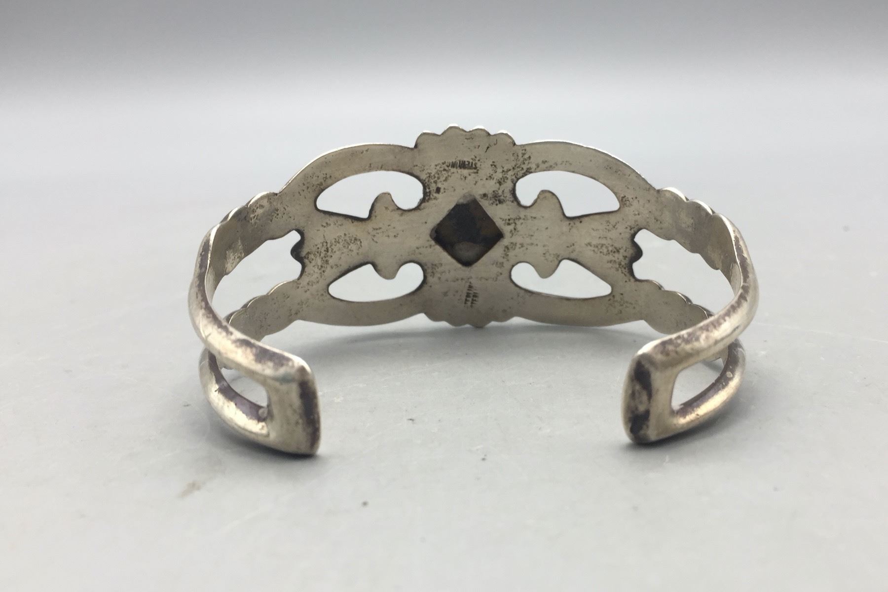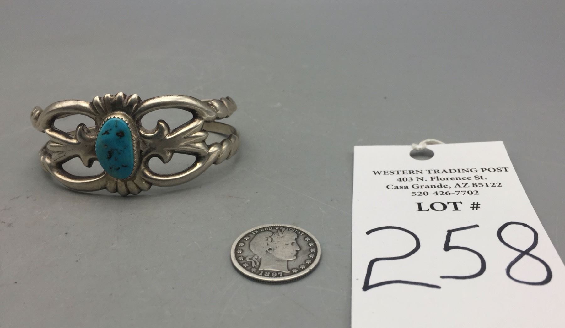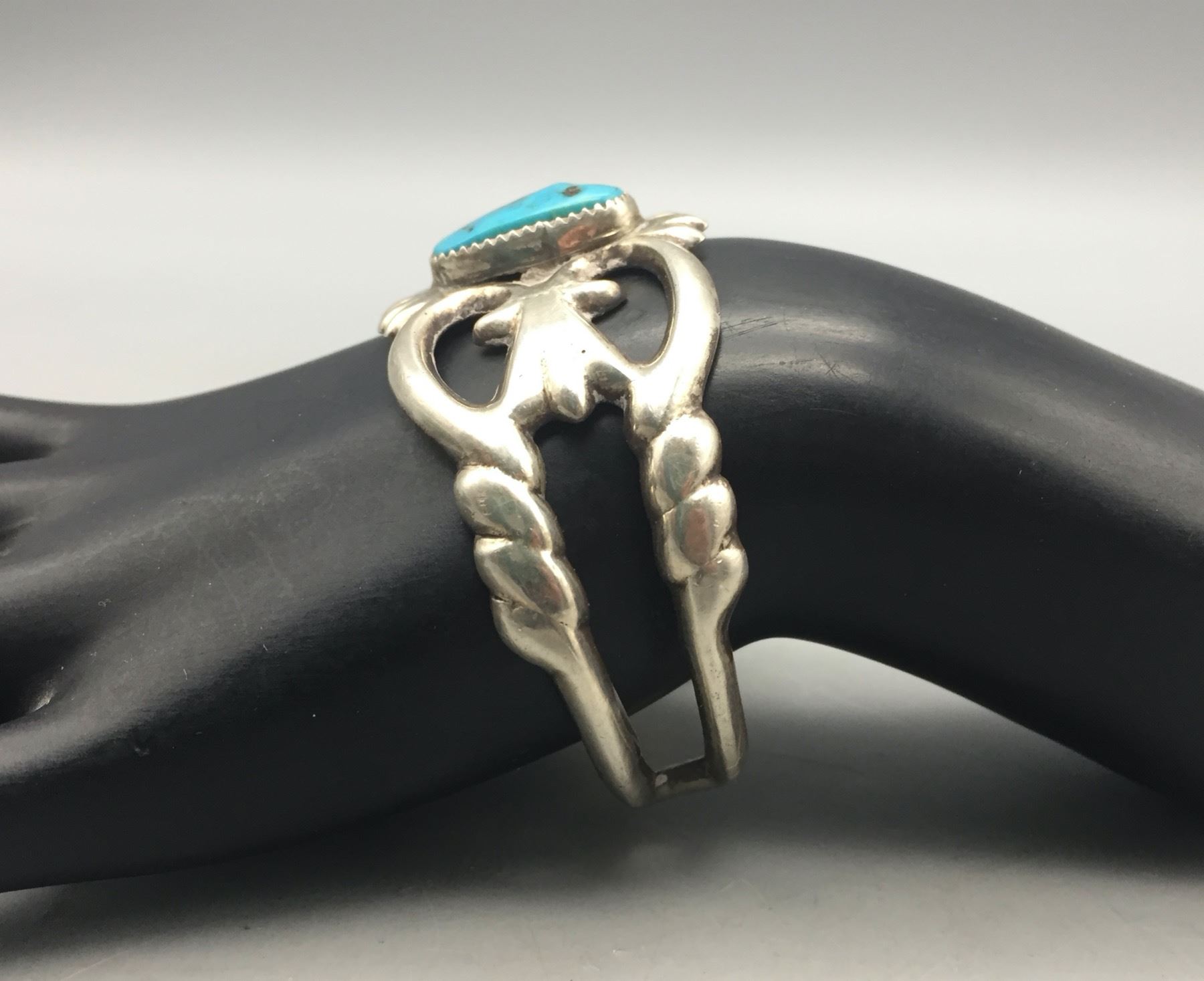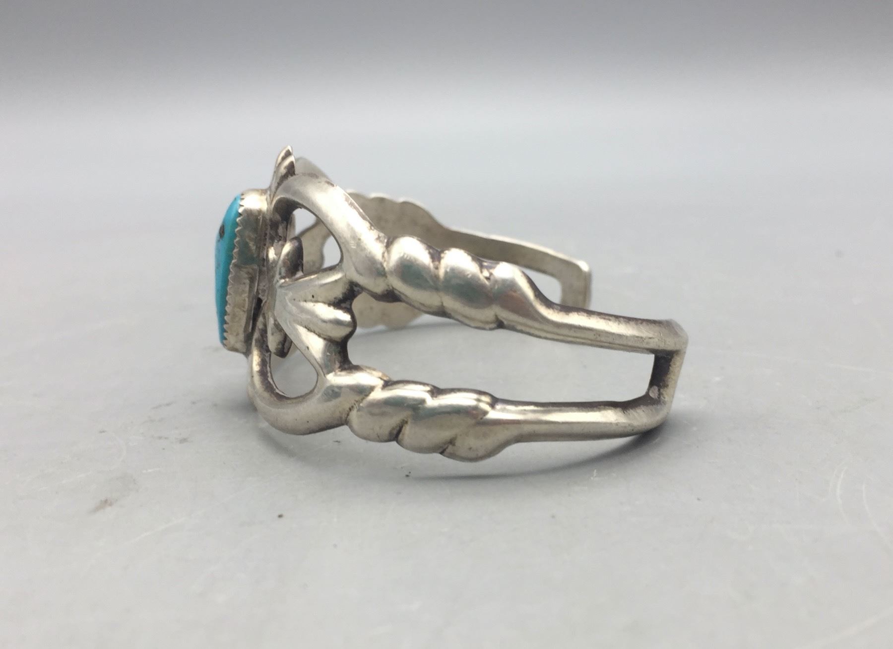 Description: For sale in this lot we have a beautiful, vintage sandcast bracelet featuring a bright turquoise stone. Marked as sterling silver. Maker: Unmarked. Approx. Age: Vintage. Size: Inside circumference measures 5-5/8 inches. Opening is an additional 1-1/4 inches, fitting a 6-7/8 inch wrist. Width is 1-1/4 inches. Weighs 44.2 grams. Condition: Good for its age, normal wear expected. Please look closely at the pictures - they are an important part of our description. Shipping: There will be a $5 handling, packaging fee for shipping this lot. The actual cost of postage will be added on top of that.