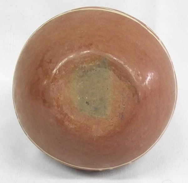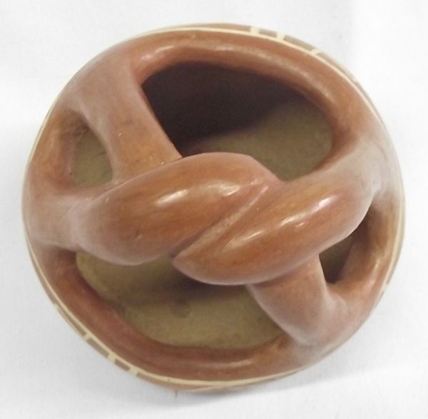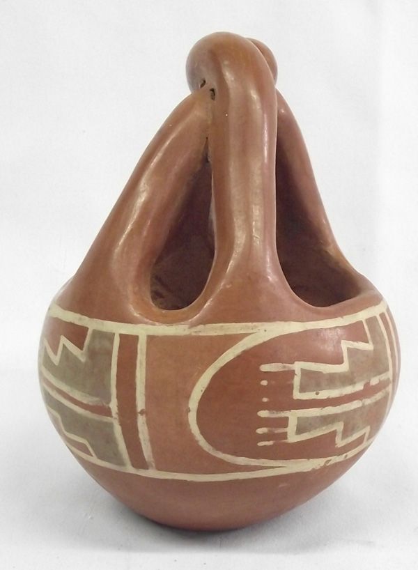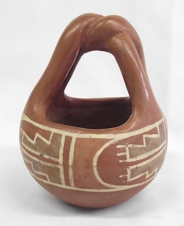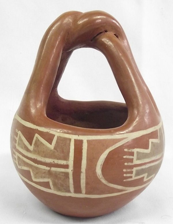 Vintage Santa Clara Twisted Handle Pottery Basket. Traditional older pottery with thick walls and very nicely balanced. Has lighter colored designs with white outlines. In nice shape with some wear typical for an older piece. Measures 5.5''H x 4.75''W and is not signed.