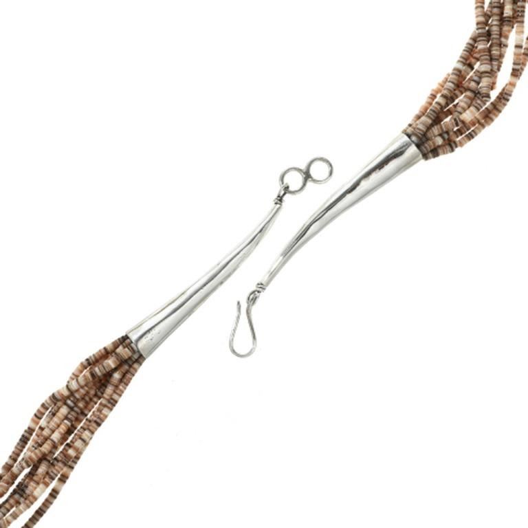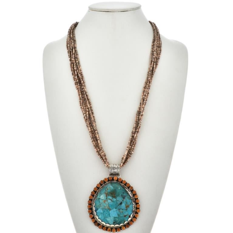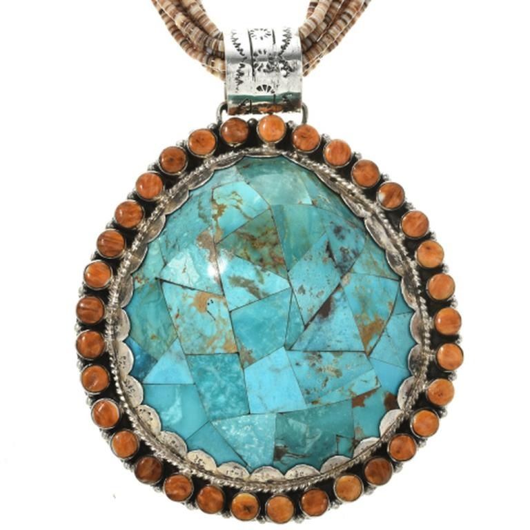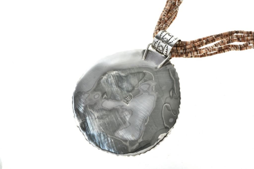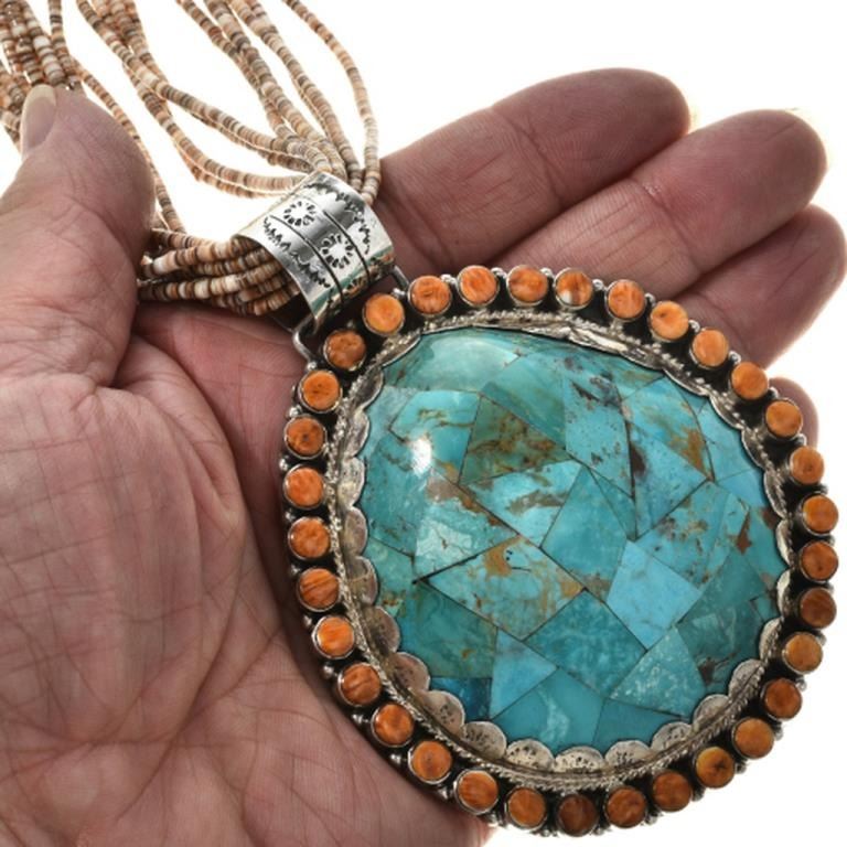 Necklace. A mosaic inlay of genuine Turquoise covers the large shell which is backed in Sterling. Set in a hammered bezel surrounded with twist wire and a halo of Spiny Oyster rounds. It comes with a ten strand, shell heishi necklace. The pendant is 4-1/4" long (includes 15mm, hammered bail) and is 3-1/4" wide. With the curved Sterling cones and hook/eye clasp, it's 29" long and is hallmarked JP and Sterling.