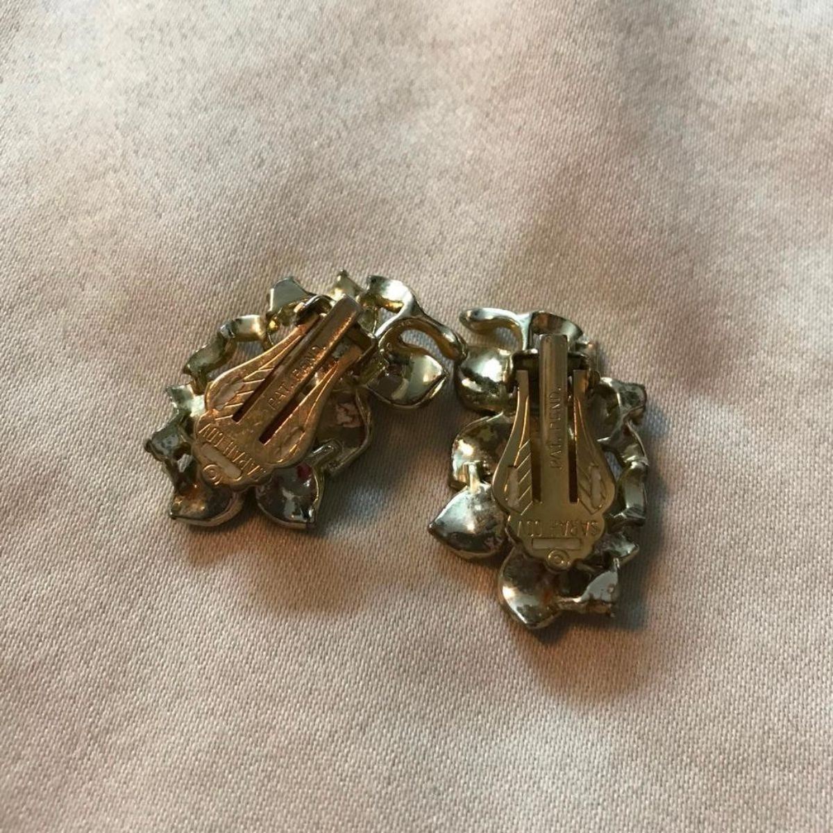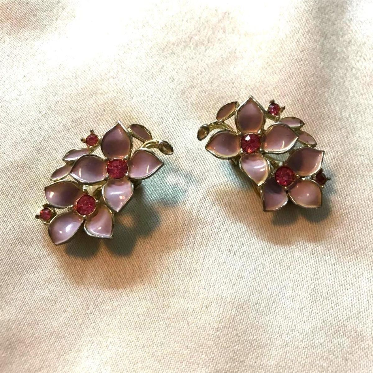 Vintage signed Sarah Coventry floral form clip-on earrings. Pink enamel on gilt with inset pink crystals. Stamped "Sarah Cov" on back clips. 1 3/8" L X 6/8" W.Â