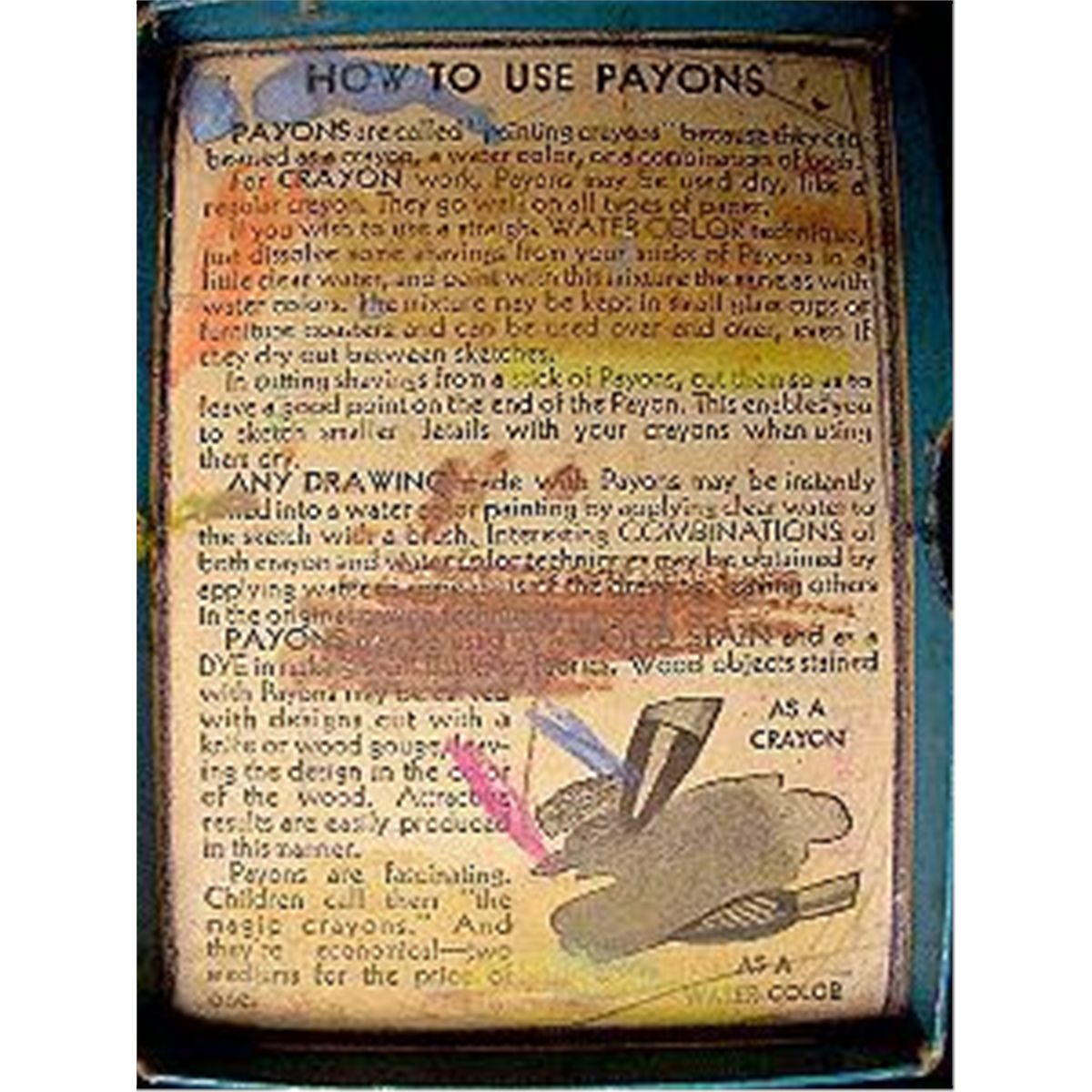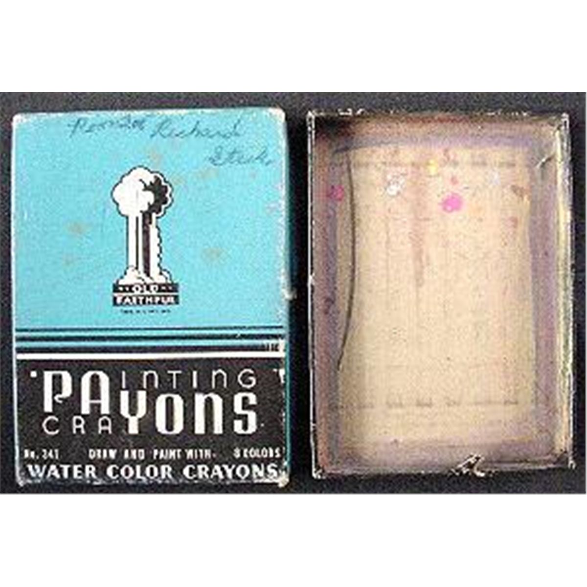 Here is a vintage box from a set of Payons--painting crayons, No. 341. It is in good condition with some ink writing on front (Room 208, Richard Strick), a tear on the edge and corner, and spotting. The box is blue with an image of old faithful. This will make a nice display piece for collectors of old school supplies.