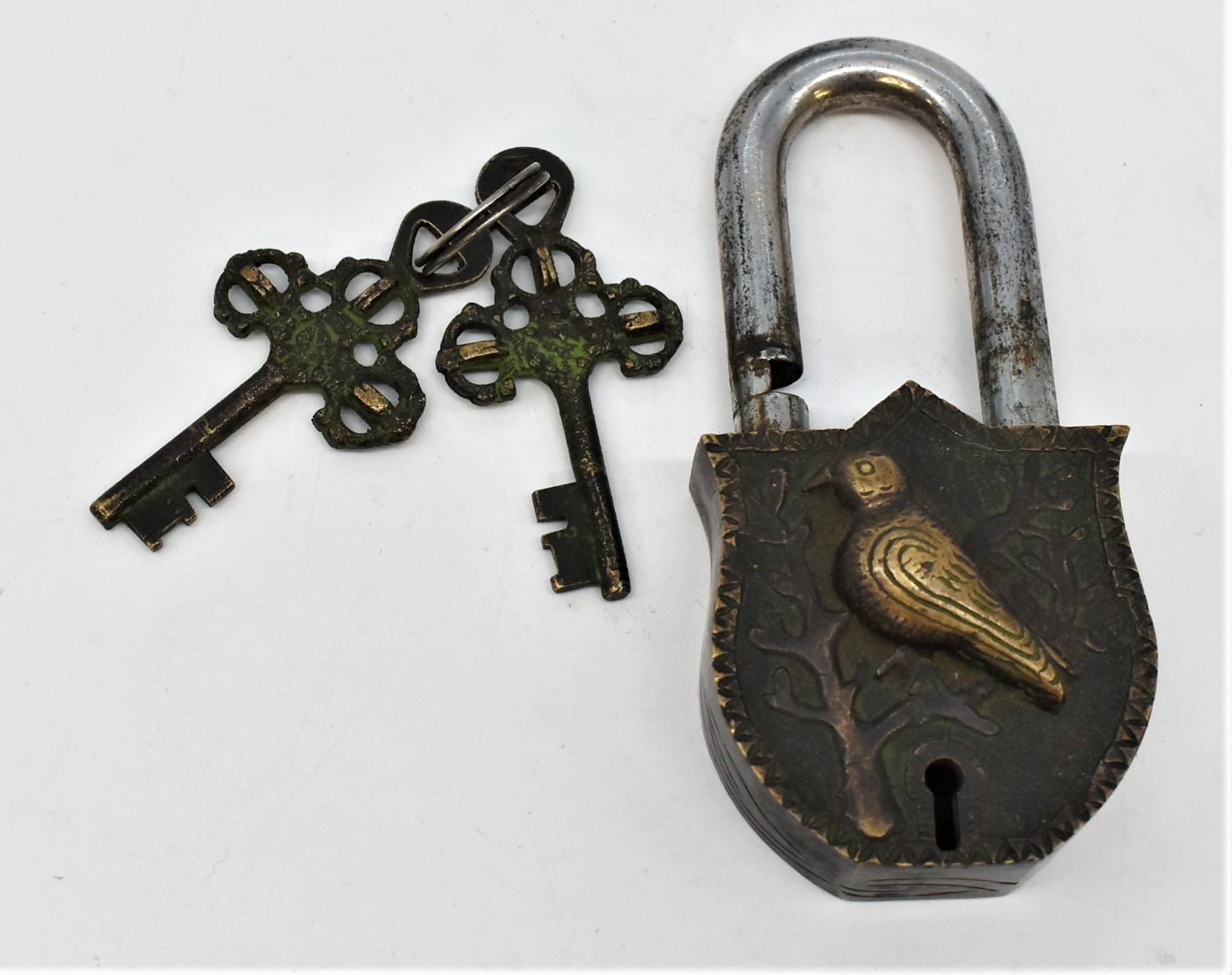 Antique Vintage Scottish Embossed Brass Padlock w/ Keys, repousse' bird on front, measures 2.5'' x 4.5'', comes with bag