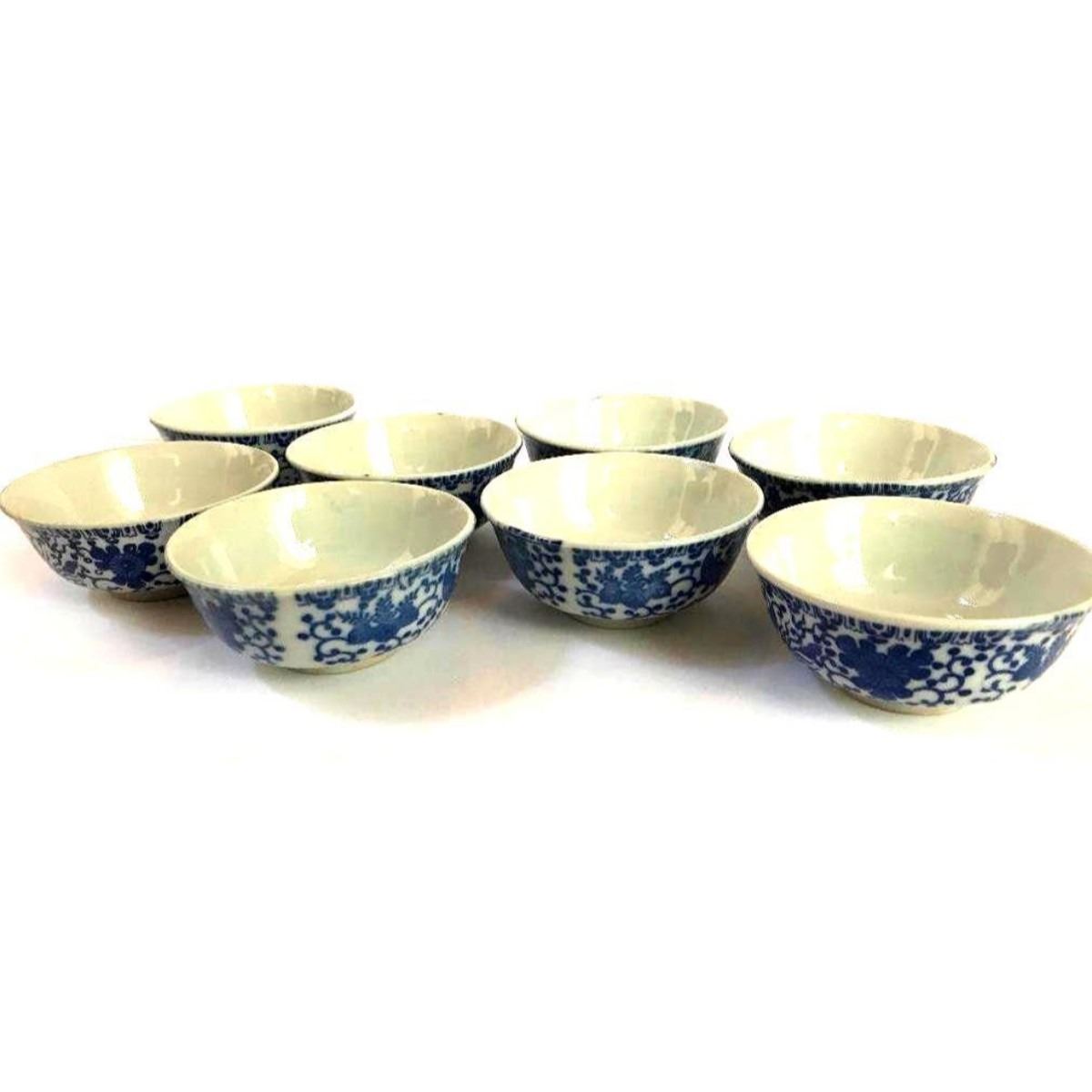 Vintage 1920's - 1940's Japanese Nippon blue & white Phoenix, "Flying Turkey" ( also known as Blue Howo China ) soup or rice bowls. 4 1/2" D X 2" H.  Marked “Made in Japan†on bottoms. * minor irregular marks & one with hairline crack to inside due to age.Â