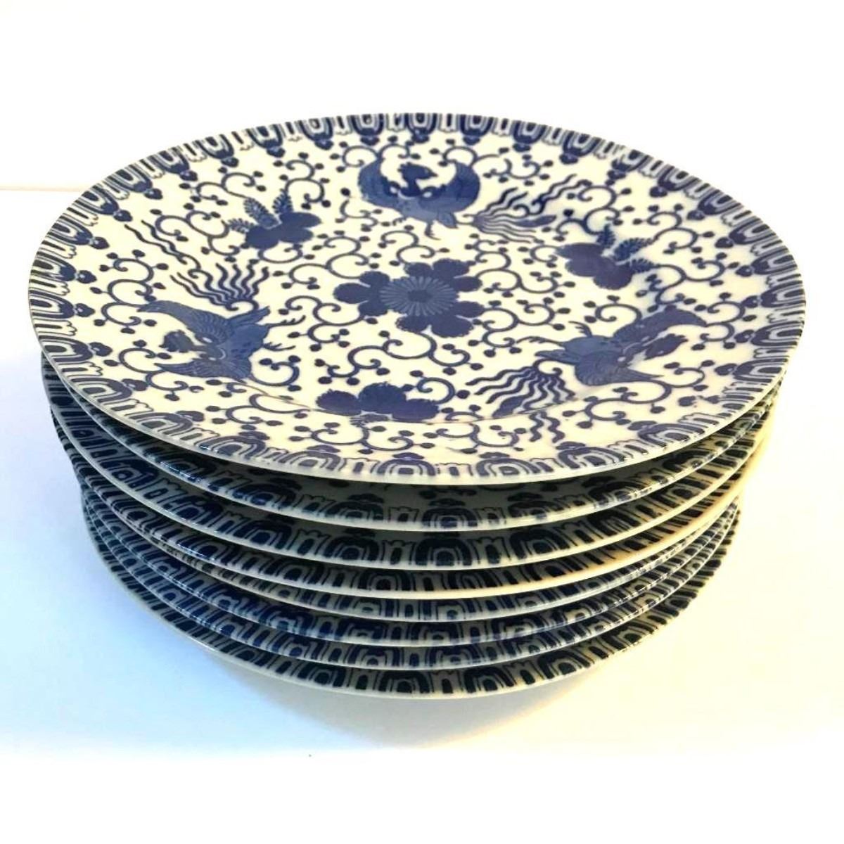 Set of 8 vintage c.1920’s - 1940's Japanese blue & white "Phoenix" or "Flying Turkey†dinner plates - also known as Blue Howo China. All marked “Made in Japan†on bottom. Made in Nippon Japan. 8 1/2"D. * one plate has a chip to the rim & another has spider crazing on the reverse side, as seen in photos.