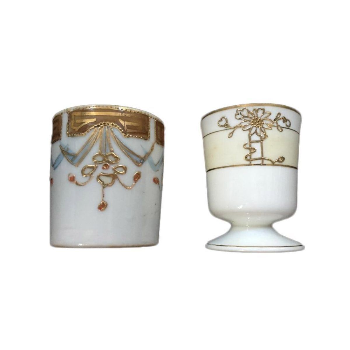 Dainty set of Nippon china toothpick holders, includes; a 1920-1920's gold gilt & daisy pattern Morimura Moriage pedestal with Nippon blue rising sun stamp on the bottom. 1 3/4" D X 1 1/4" H & a 1902' -30's gold gilt with