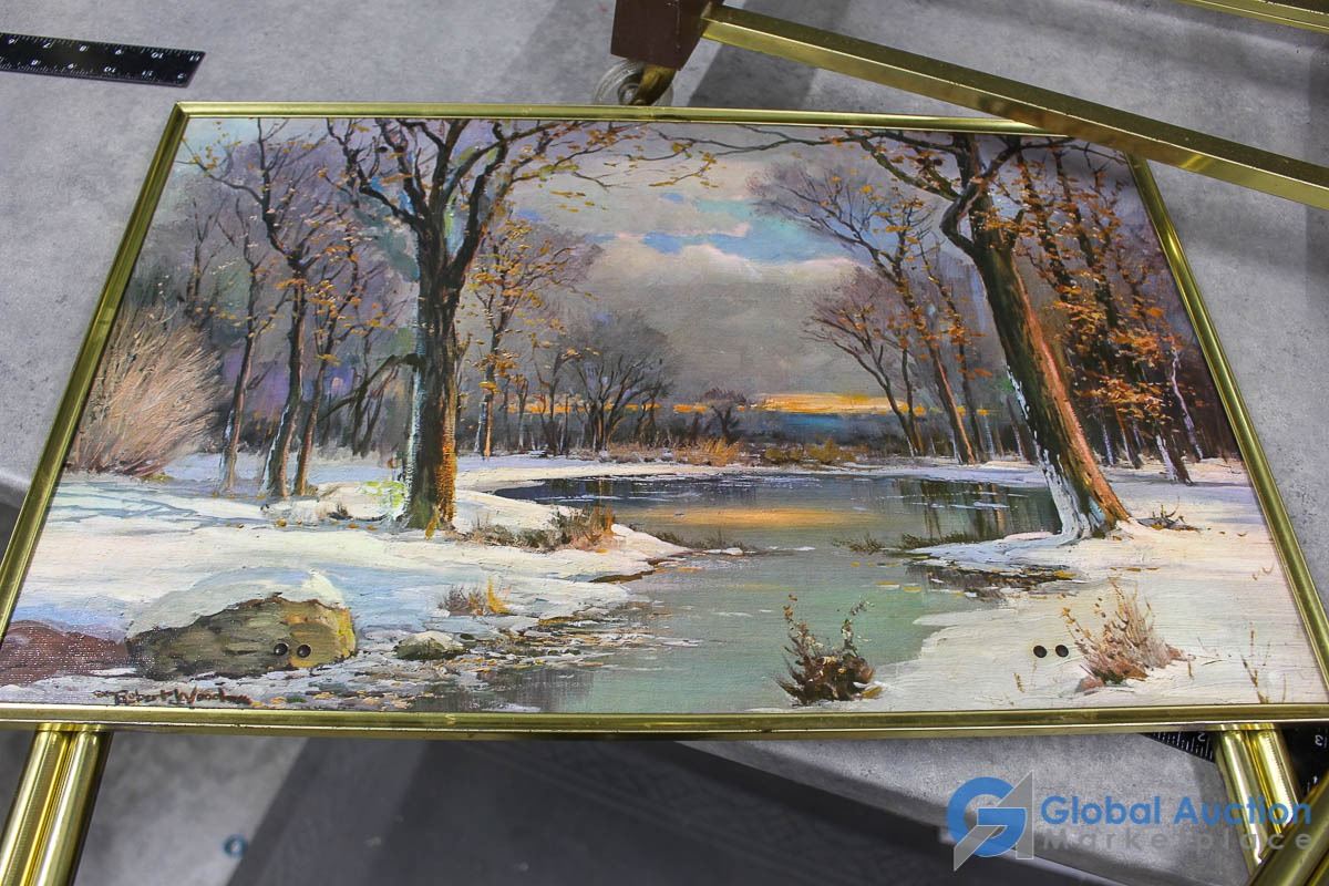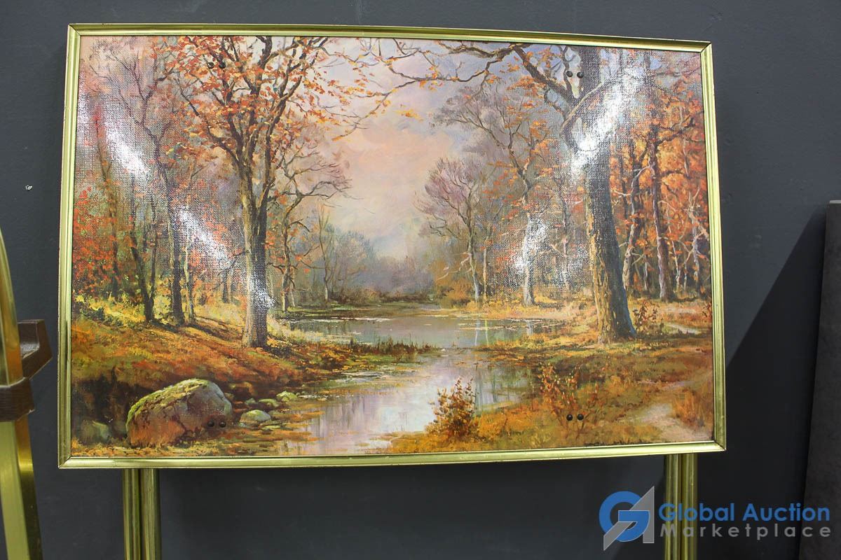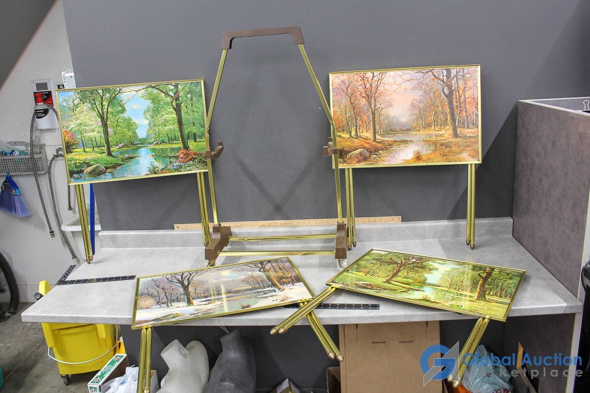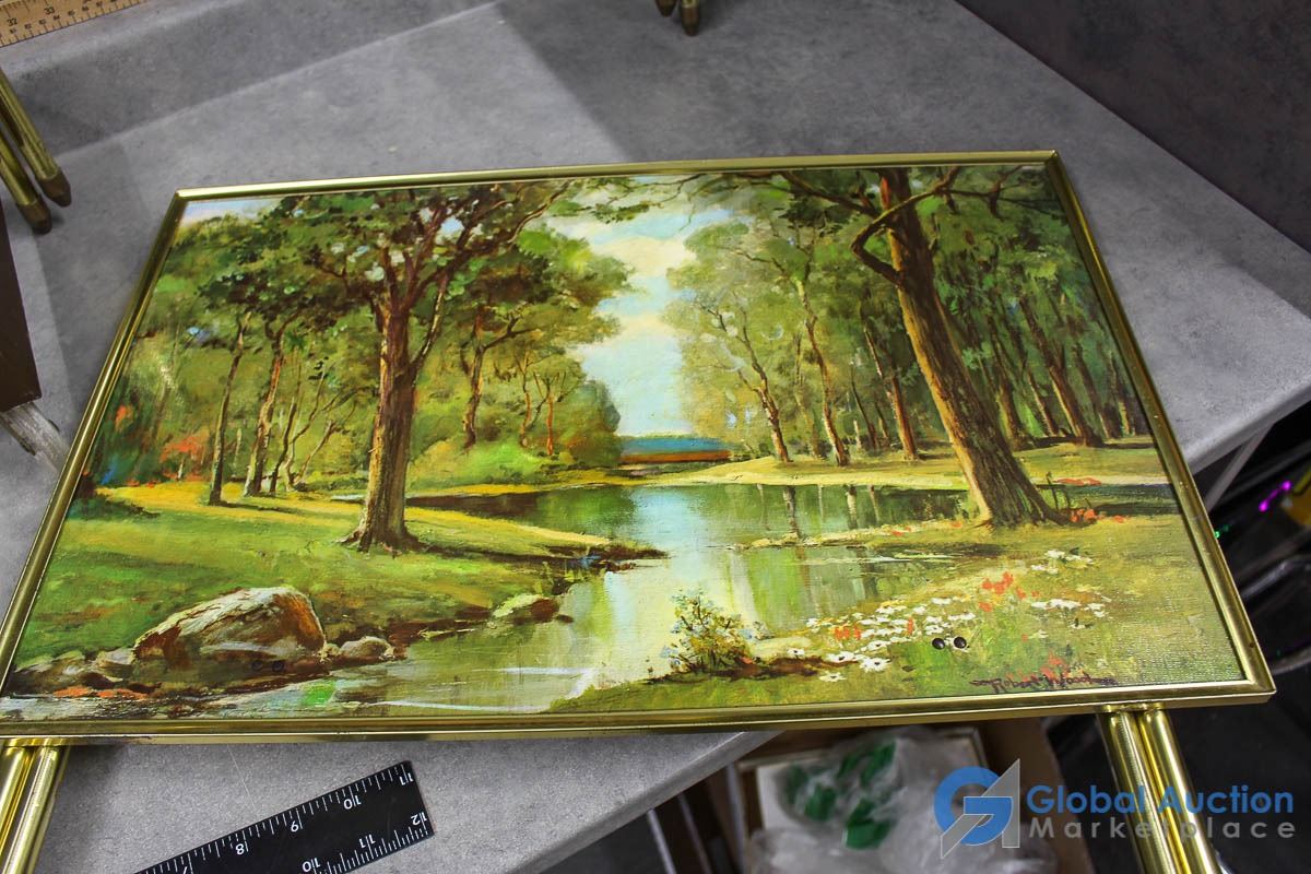 **Vintage Set of (4) Tin TV Table Set w/Stand - Robert Wood Art - All Four Seasons Scenery