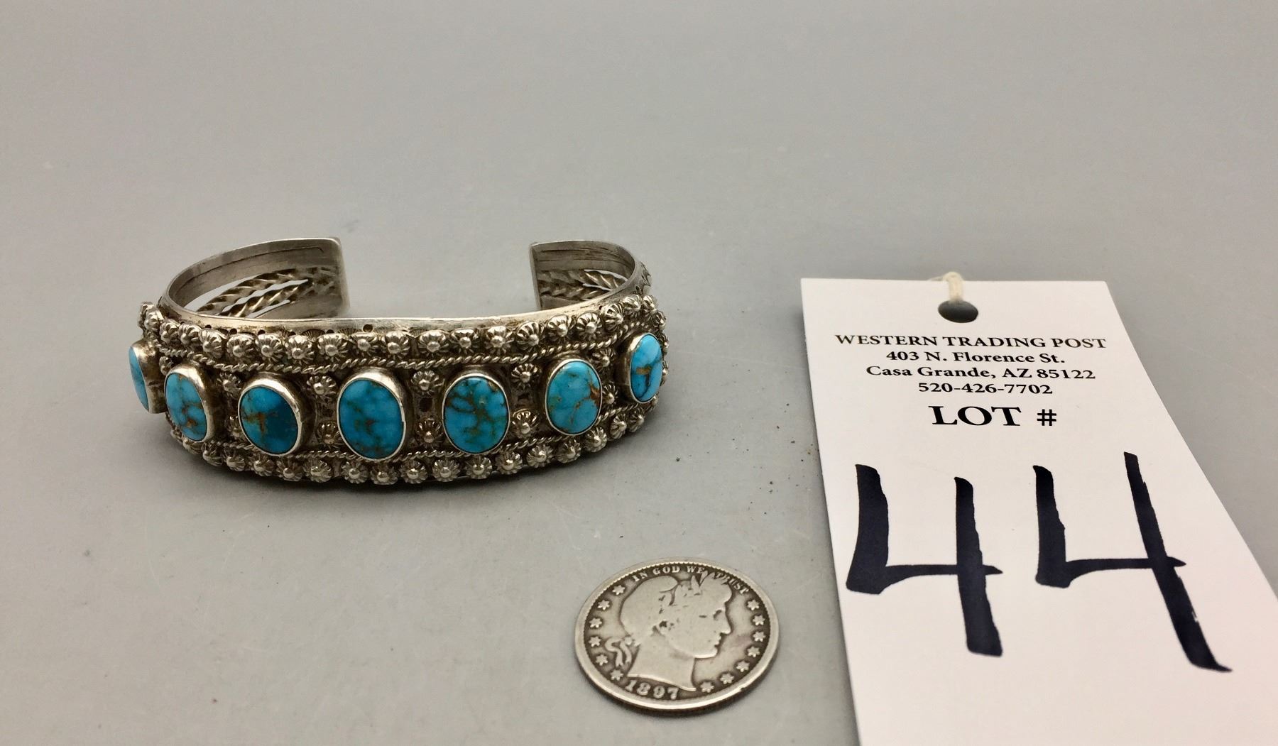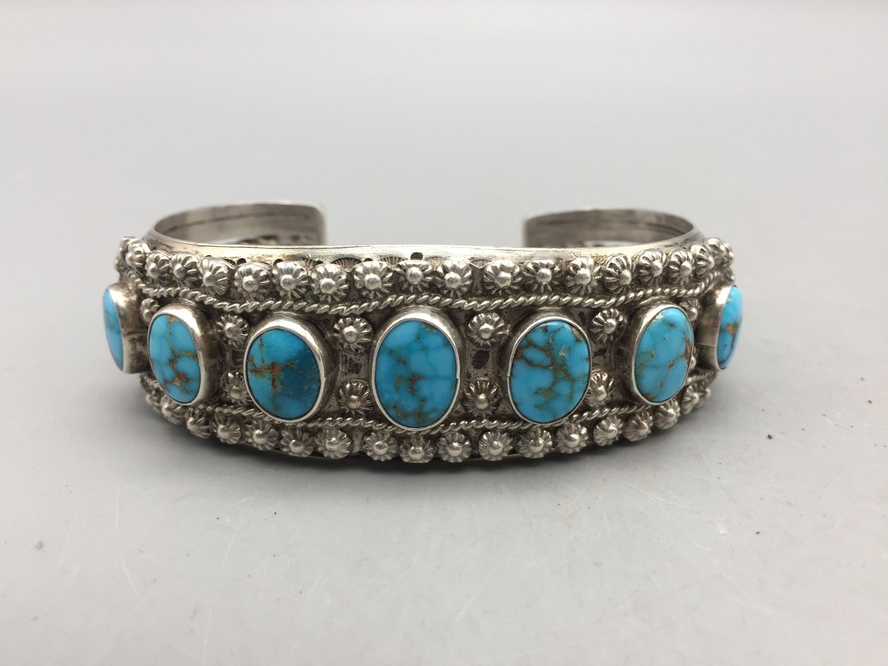 Description: Available for sale in this lot is a nice cuff bracelet. This bracelet features seven turquoise stones in handcrafted silver work. Tested as sterling silver. Maker: No hallmark, but vintage Navajo style. Approx. Age: Circa 1970s vintage. Size: Measures 6” with a 1-1/4” opening, (fits a 7-1/4” wrist). Weighs 65.2 grams. Condition: Good for its age, normal wear expected. Please look closely at the pictures - they are an important part of our description. Shipping: There will be a $5 handling / packaging fee for shipping this lot. The actual cost of postage will be added on top of that.