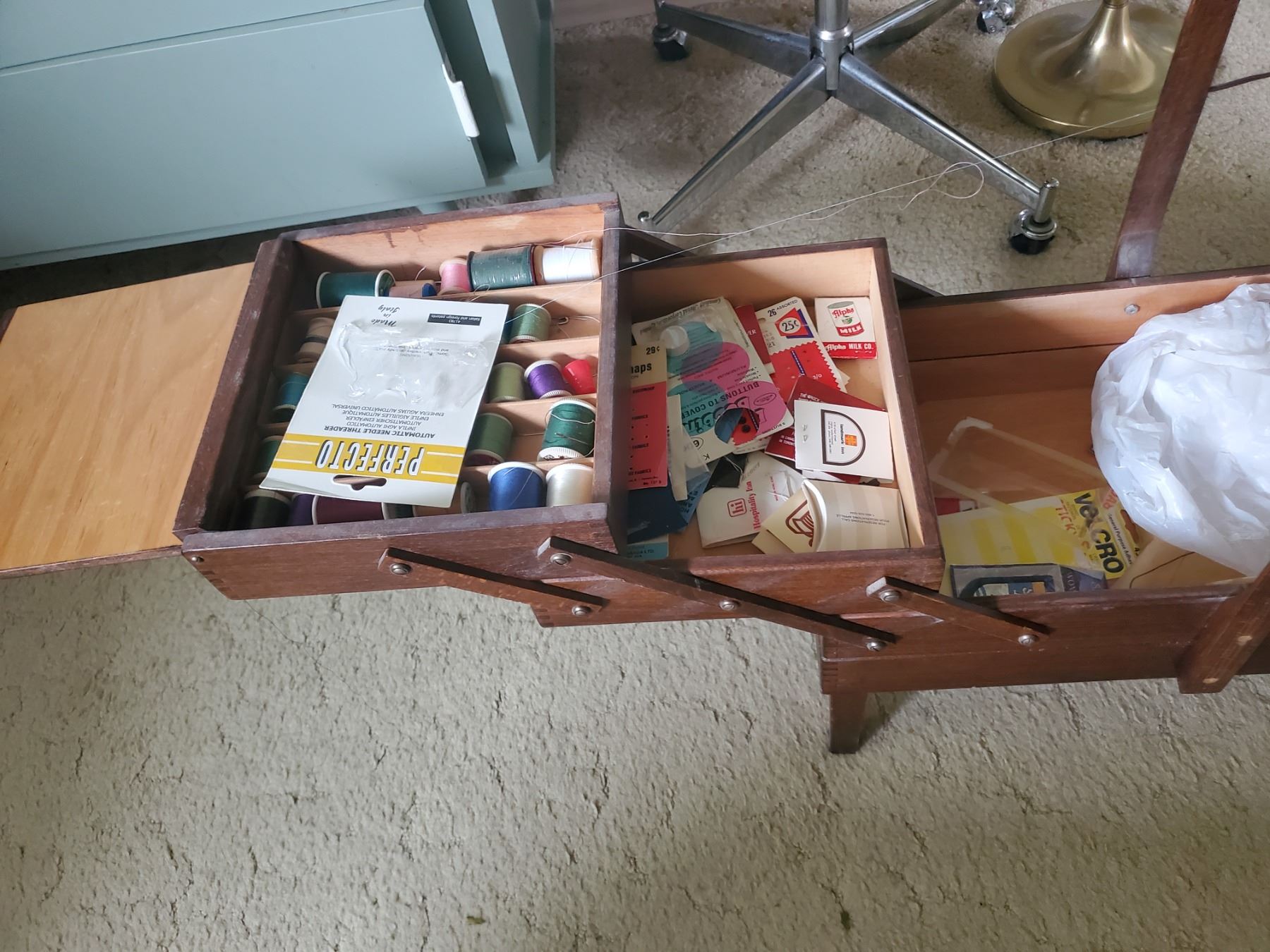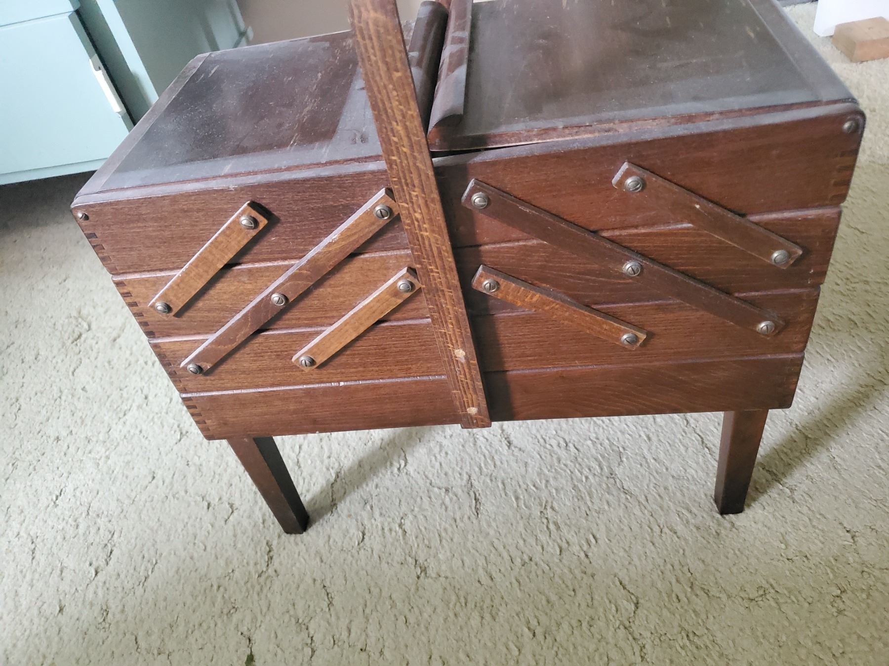 Vintage Sewing Box with Sewing material Inside, 19.5" s x 10.5" d x 22" h