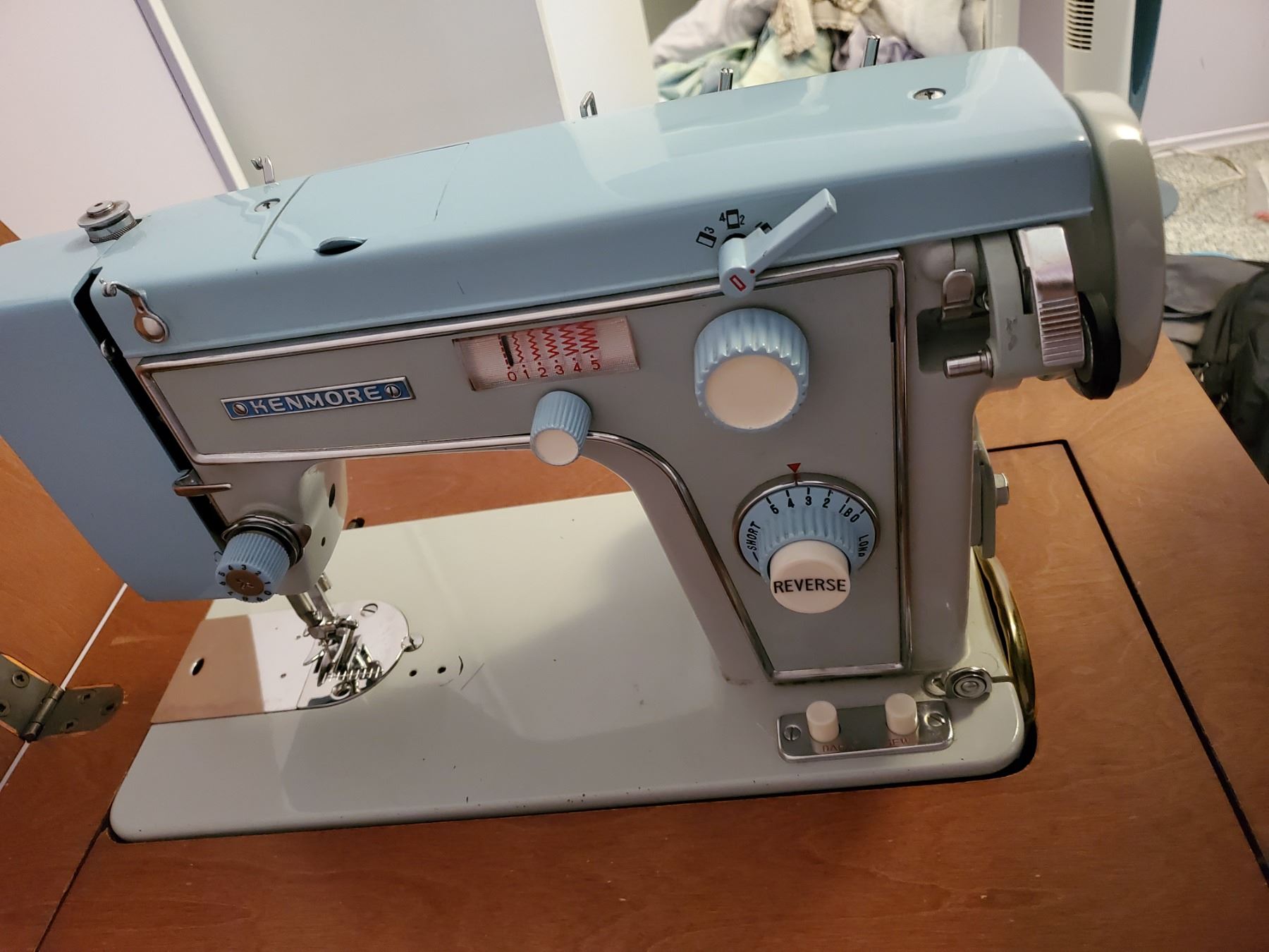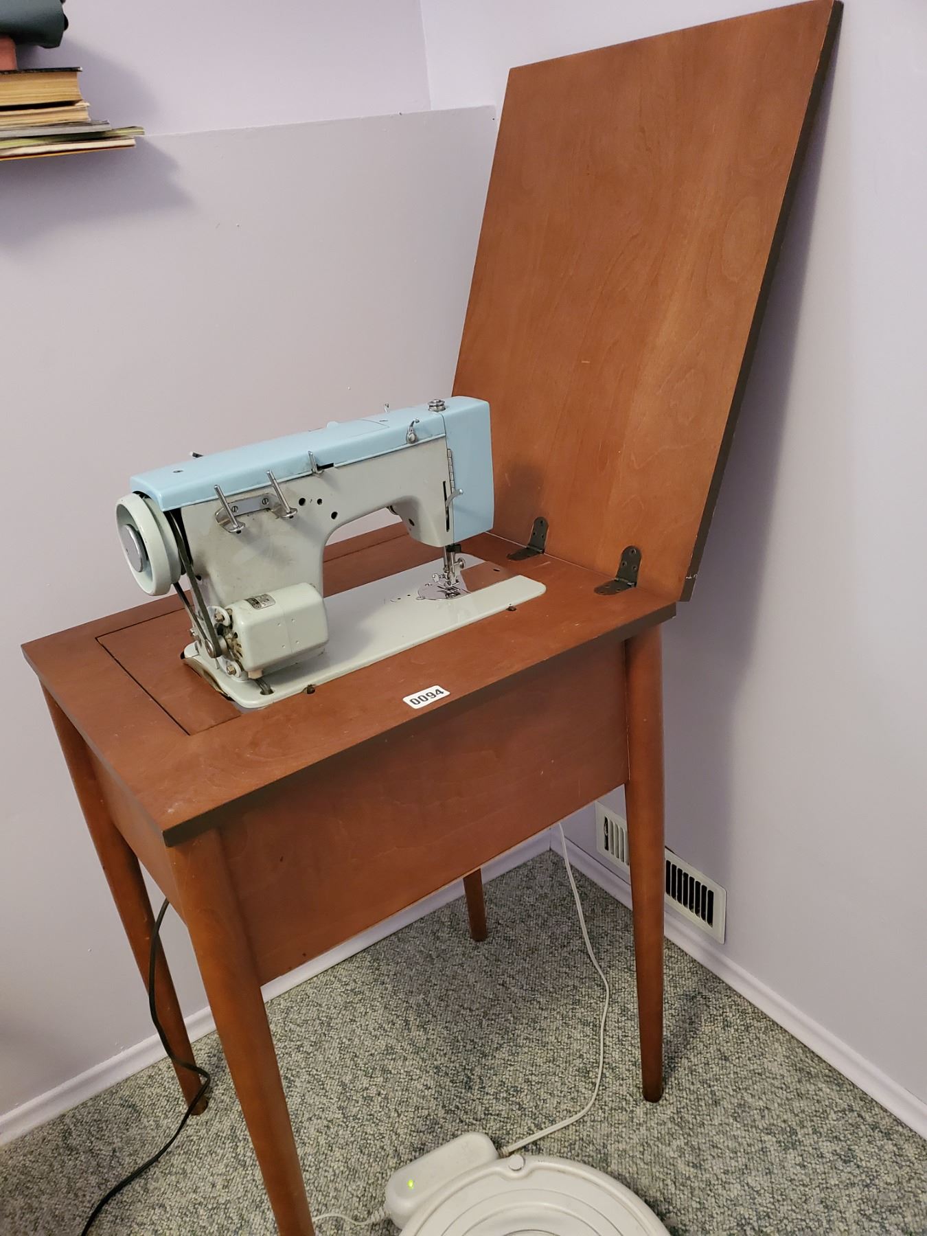 Vintage Sewing Table with Machine +Vintage Sewing Books