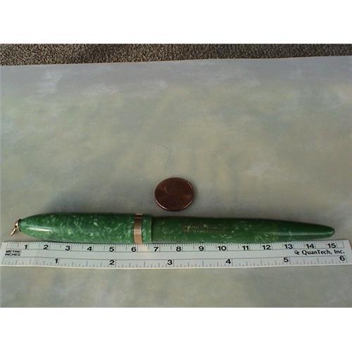 1930 Sheaffer lifetime jade green lever filling balance pen is hard to find because it was a transition fountain pen. Sheaffer was streamlining the big full sized balance pens. Light brassing at clip and there is discoloration. Will fit into collection as this model are not easy to find.Will ship worldwide. Optional insurance.