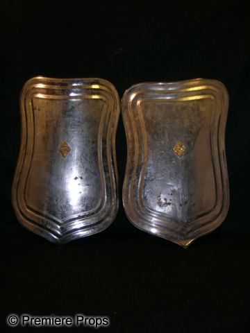 Lot of (2) thin metal shields likely used on any number of Roman/Gladiator epics from MGM. The shields have a small golden emblem affixed to the front center. Two cloth armbands are fastened on the back of each shield for attachment to the actor's arm. Shields have some dings and light rust on them. (Measures approx. 18 1/2"x13" ea.).Oversized item. Additional postage required.