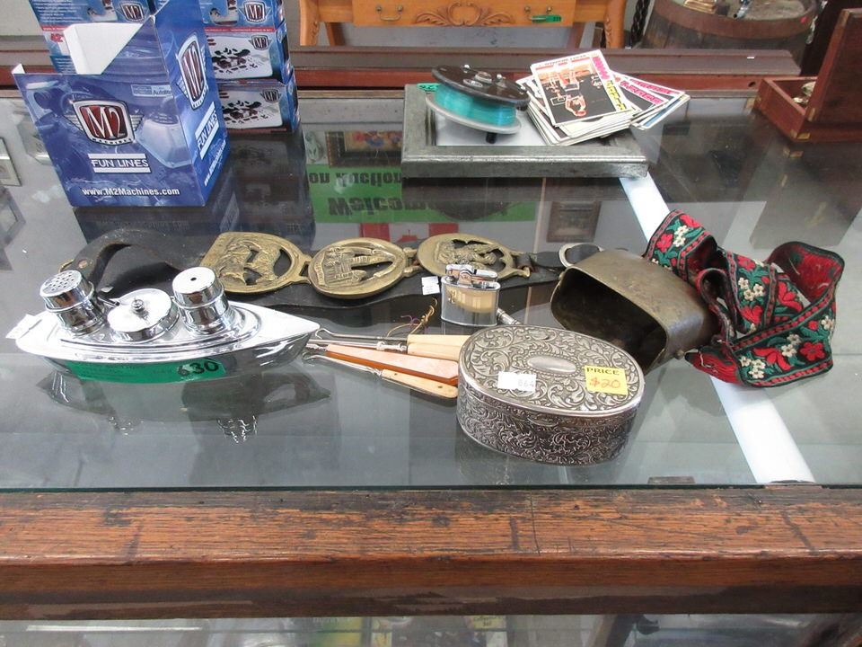 Condiment set has cobalt glass liner. Includes horse brasses, cow bell & button hooks.