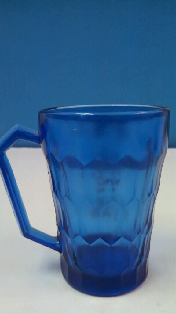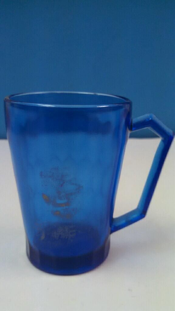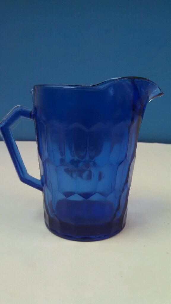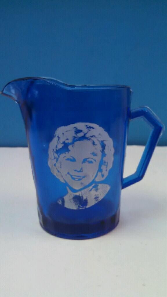Shirley temple Blue Glass Pitcher and Cup for one money Pitcher is in good Condition Cup in Poor condition