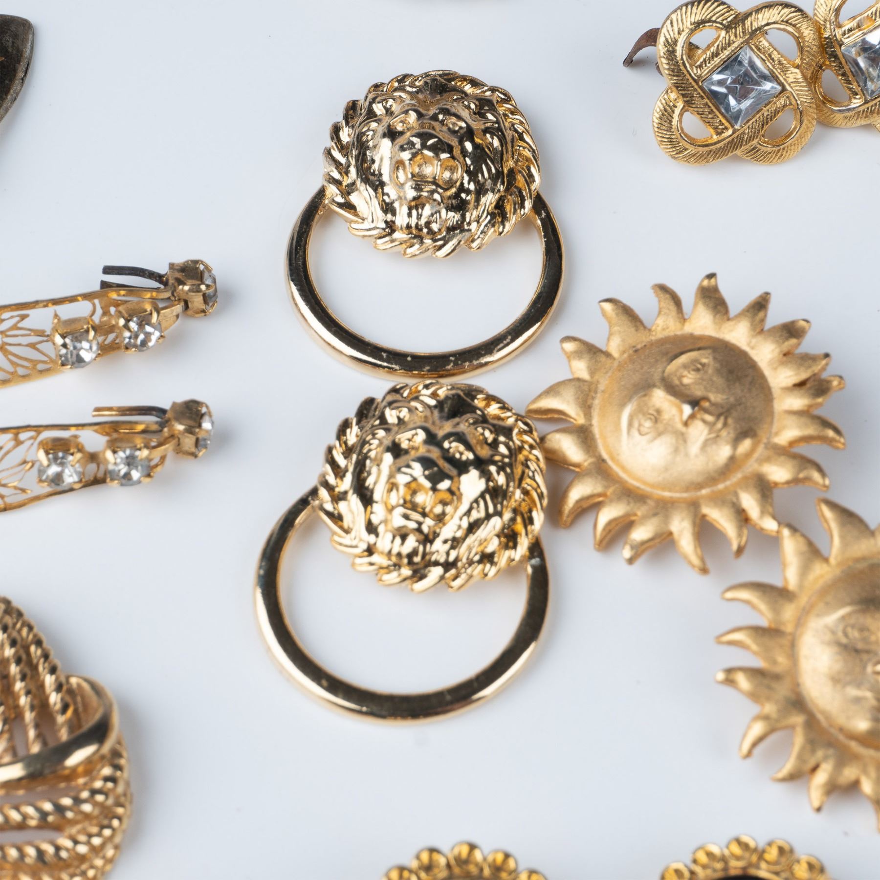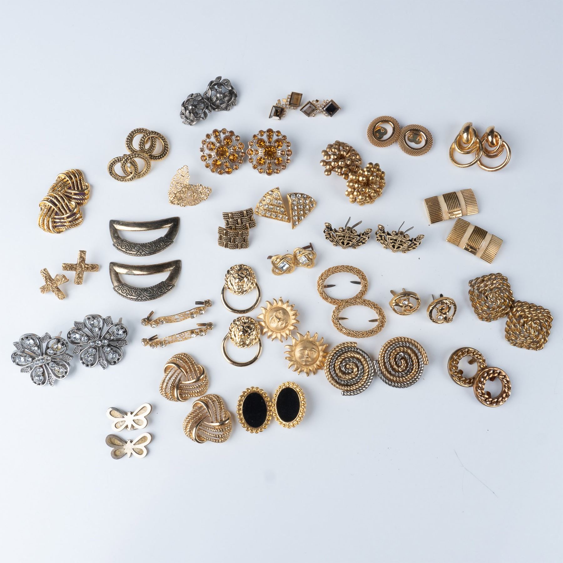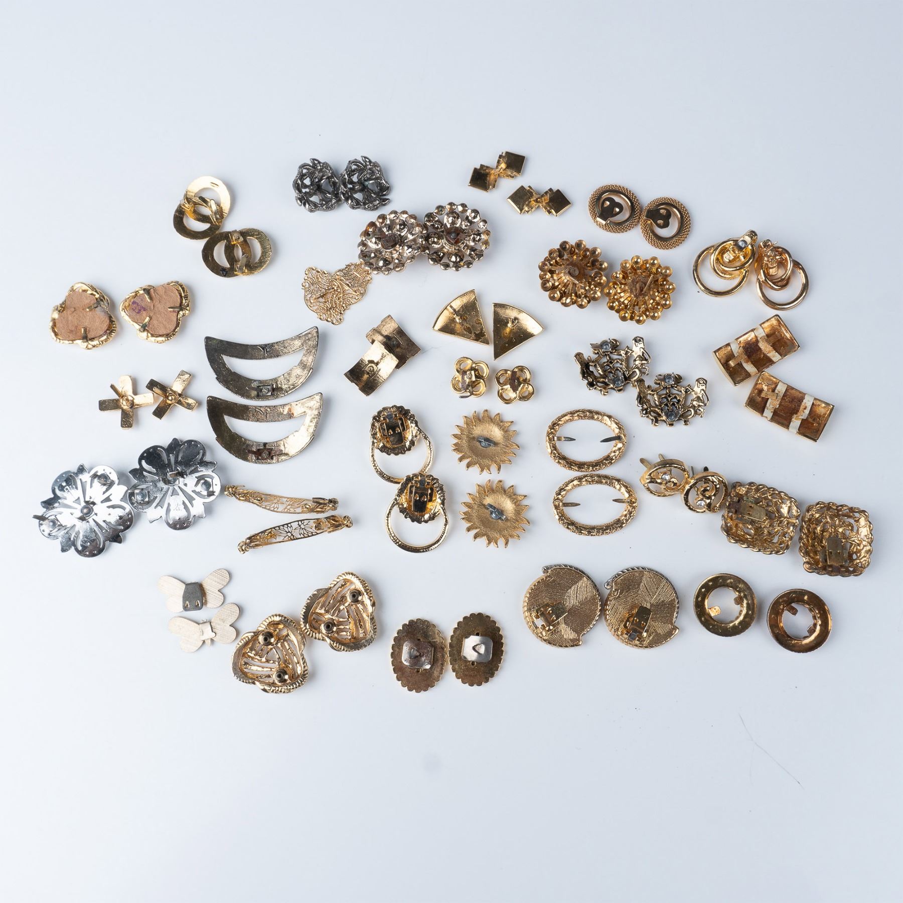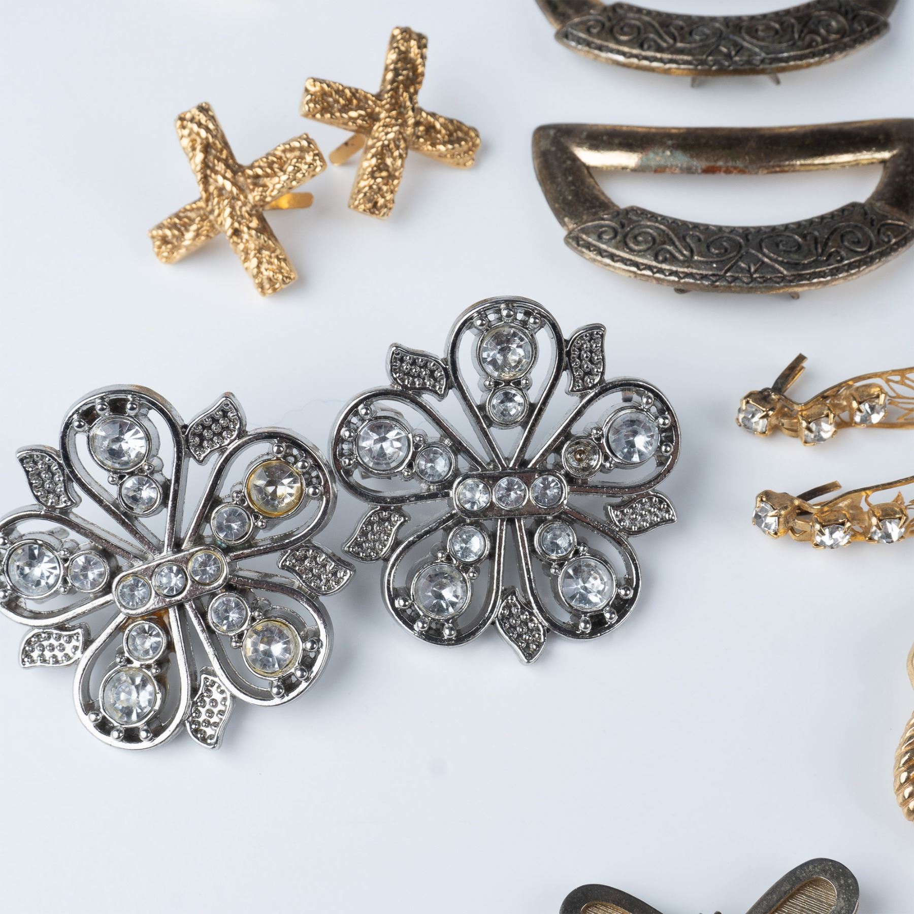 A curated collection of 28 pairs of vintage shoe clips in a variety of elegant designs, featuring gold-tone, silver-tone, and mixed-metal finishes. This assortment includes classic, ornate, and whimsical styles, ranging from intricate filigree patterns to floral motifs, geometric shapes, and textured embellishments. Some pieces incorporate sparkling rhinestones, sculpted metalwork, and enamel detailing, adding a touch of sophistication to any footwear. Perfect for vintage fashion enthusiasts, costume designers, or collectors, this lot offers a diverse selection of decorative clips suitable for enhancing shoes, handbags, or accessories. Largest item measures 2.25"L.