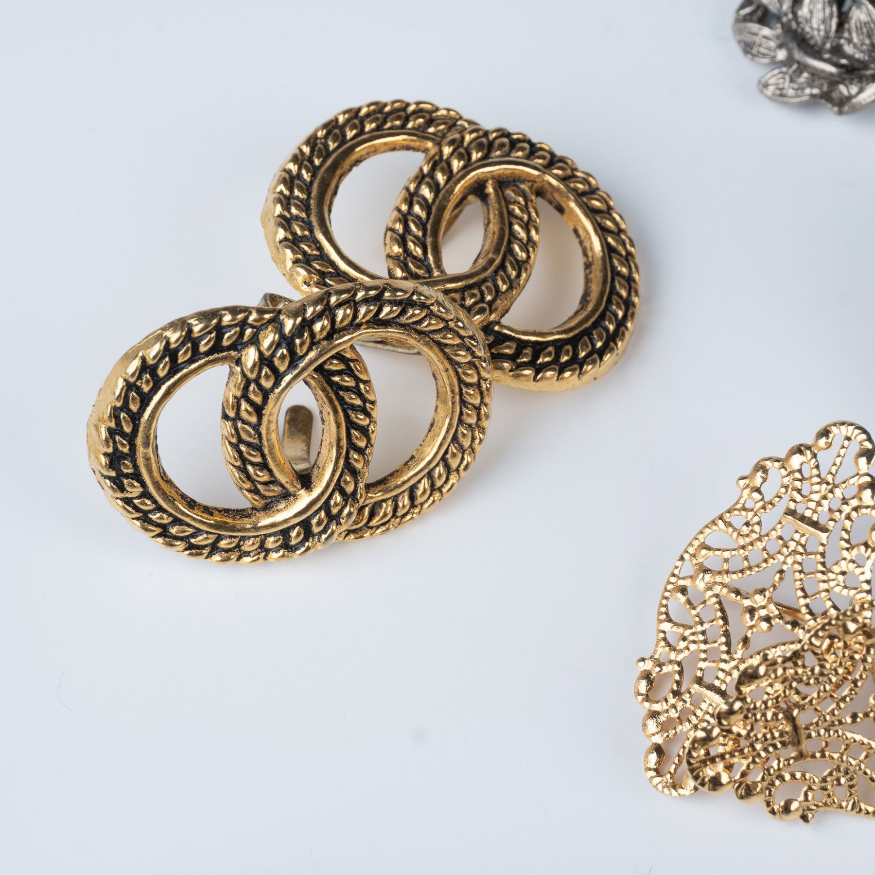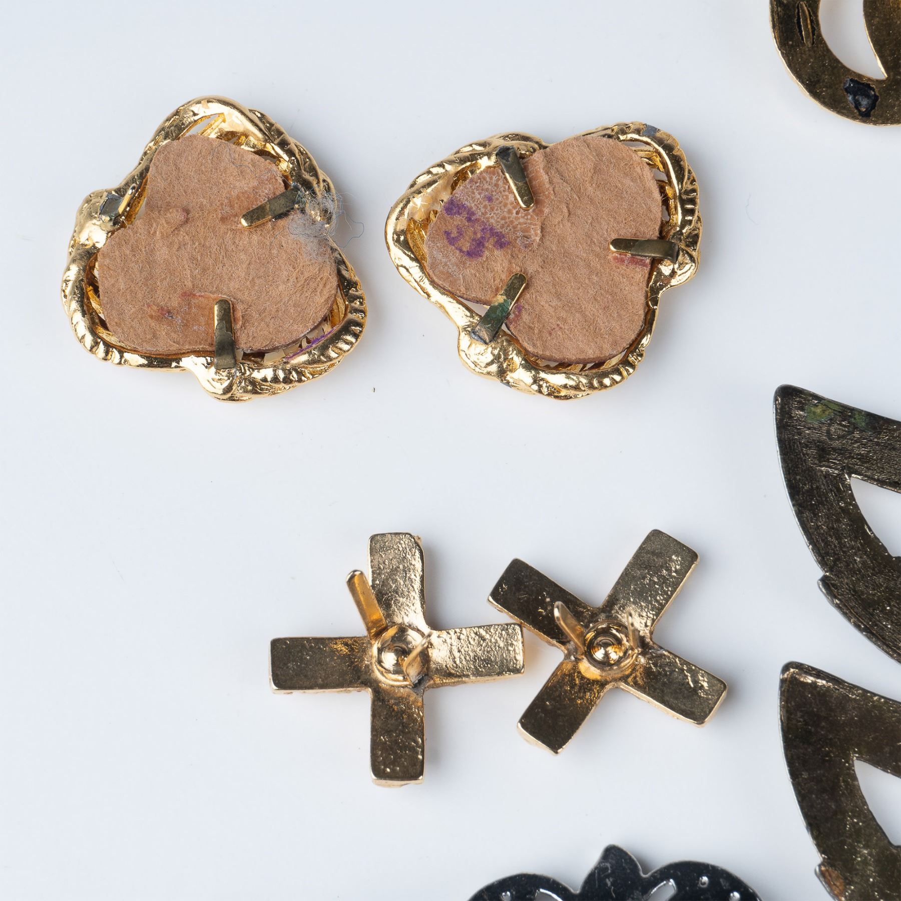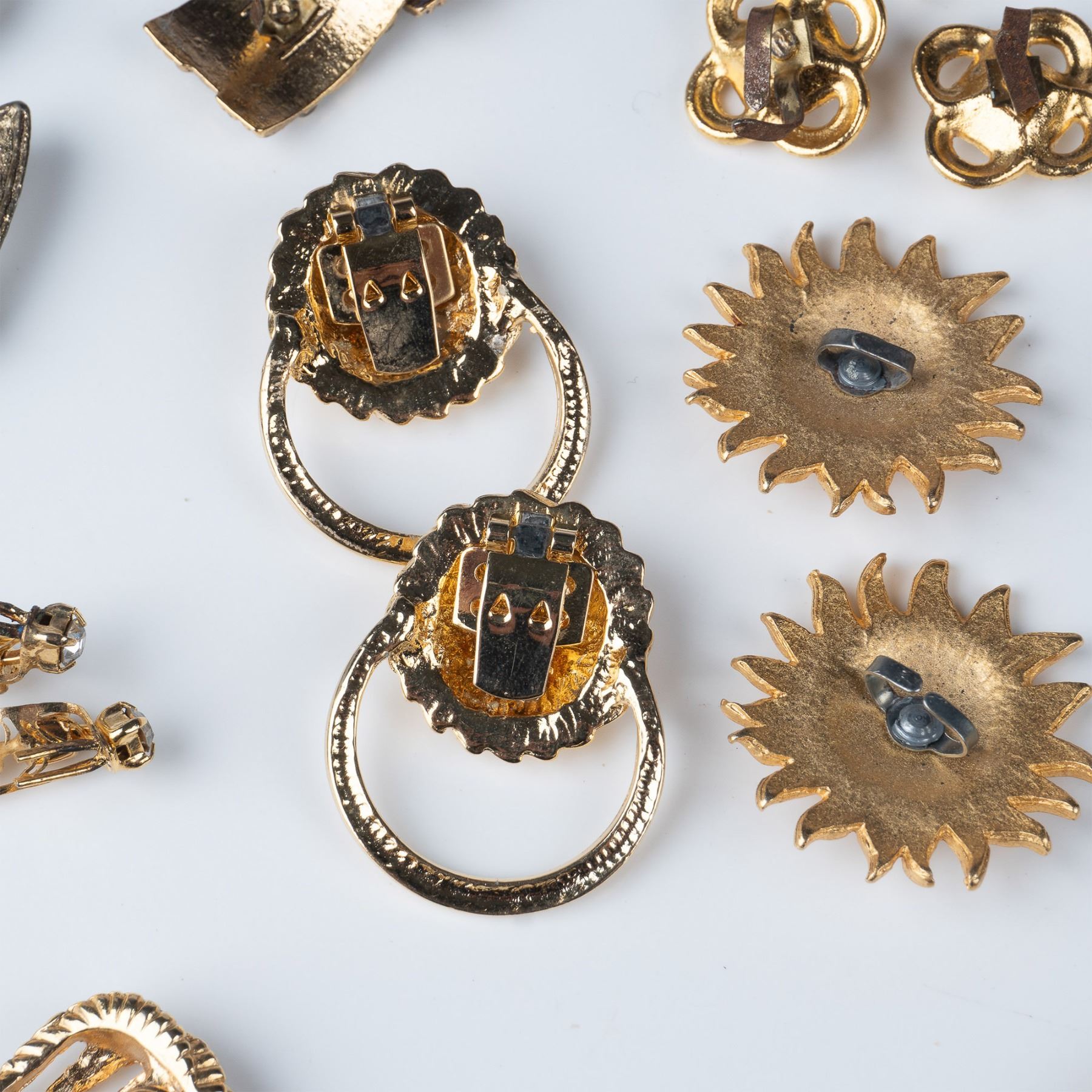 A curated collection of 28 pairs of vintage shoe clips in a variety of elegant designs, featuring gold-tone, silver-tone, and mixed-metal finishes. This assortment includes classic, ornate, and whimsical styles, ranging from intricate filigree patterns to floral motifs, geometric shapes, and textured embellishments. Some pieces incorporate sparkling rhinestones, sculpted metalwork, and enamel detailing, adding a touch of sophistication to any footwear. Perfect for vintage fashion enthusiasts, costume designers, or collectors, this lot offers a diverse selection of decorative clips suitable for enhancing shoes, handbags, or accessories. Largest item measures 2.25"L.