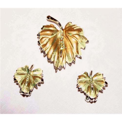 Wonderful vintage BSK Rhodium Plated Fall Leaf Brooch or Pin, enamel dipped with yellow and green, then lightly brushed with gold enameling. Beautiful Aurora Borealis vein running down the center of all three pieces. This Brooch or Pin measures 1 3/4 inches in diameter and attaches with a stem pin and C clasp with safety. The matching Earrings measure 1 inch in diameter attaching with a clip-back closure. All three pieces are marked BSK. Made in the late 1940s; found in my book of Signed Beauty of Costume Jewelry.