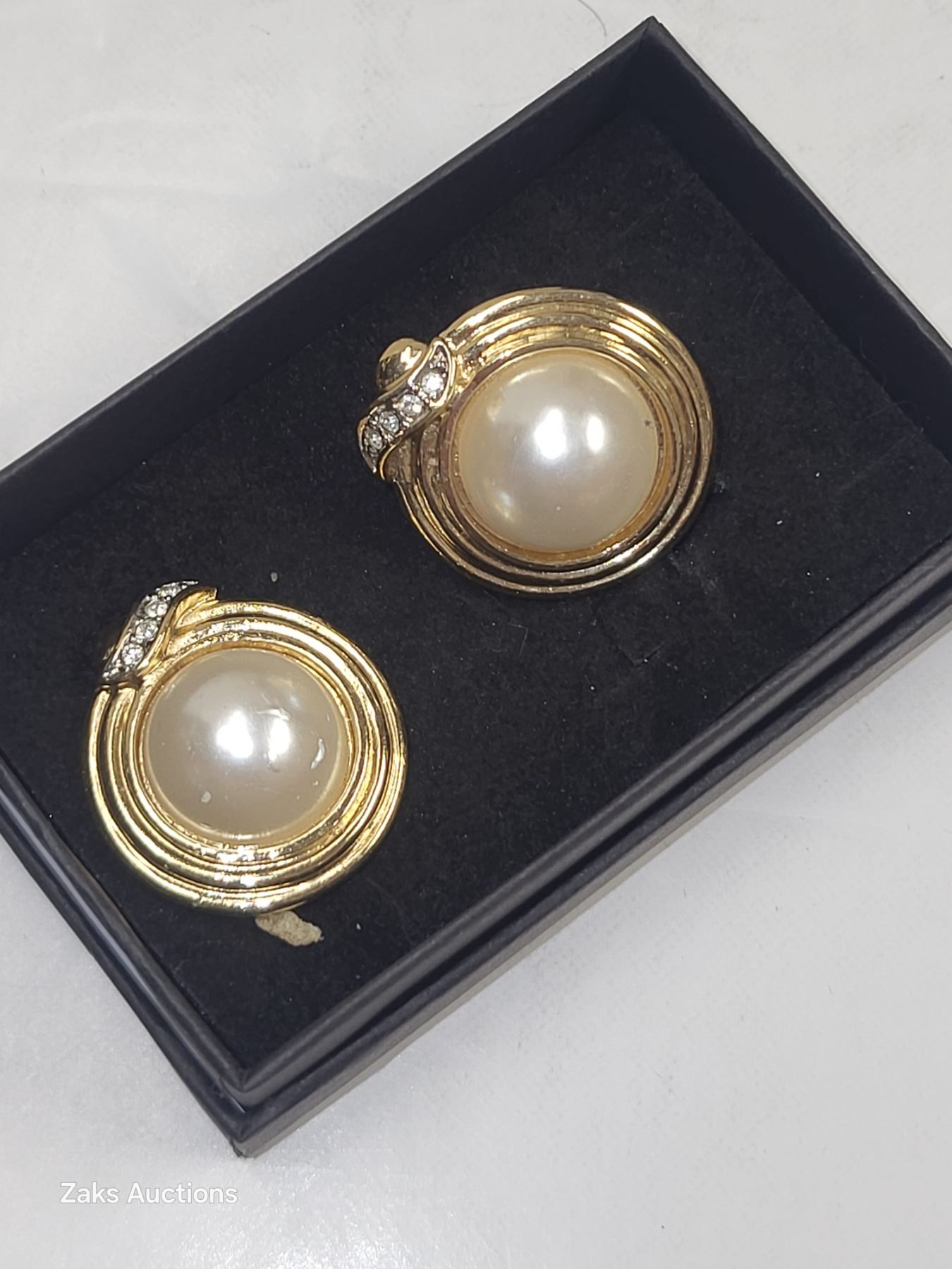Vintage Signed Butler Simulated Pearl & Crystal Clip On Earrings
